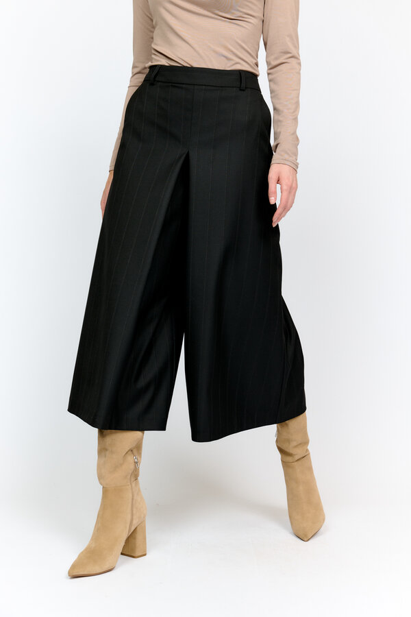 15 Брюки зауженные к низу с посадкой на линии. По центру передней части брюк расположены разрезы. Длина до щиколотки. PREMIUM QUALITY Костюмная ткань в невыраженную диагональ черного цвета (70% терилен, 23% район, 7% спандекс) 2100 1000