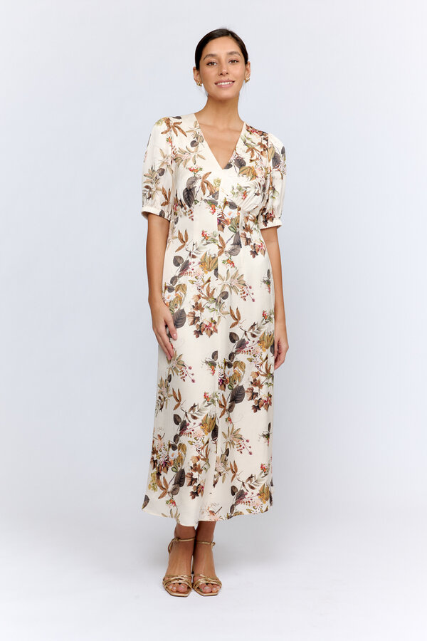 23 Платье с коротким пышным рукавом длины миди. Вышивка "цветы" на рукавах. PREMIUM QUALITY Лен плательно-костюмный премиального качества бежевого цвета Вышивка цветы (100% лен) 5880