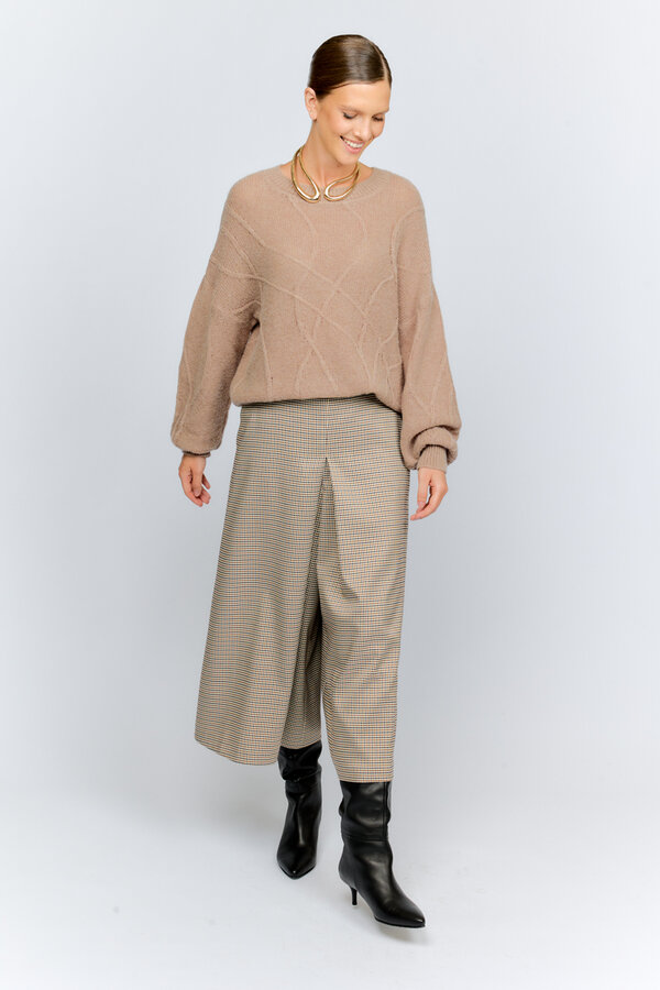 79 Брюки зауженные книзу длиной до щиколотки. Посадка на талии Костюмная ткань в мелкую молочно-горчично-черную клетку (65% п.э., 34% район, 1%спандекс) 2000 1000
