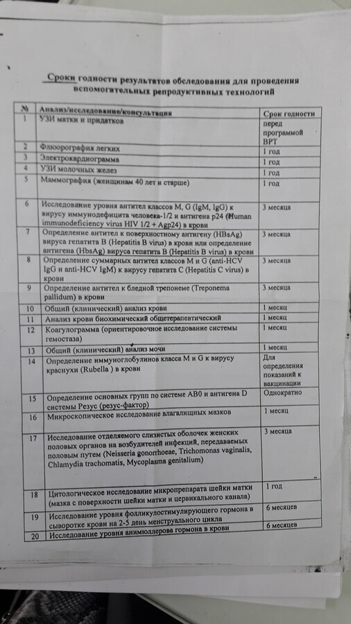 1.Общеклиническое обследование (общий анализ крови, мочи, биохимия крови)-обследование в любой день цикла. Годность- 1 месяц.