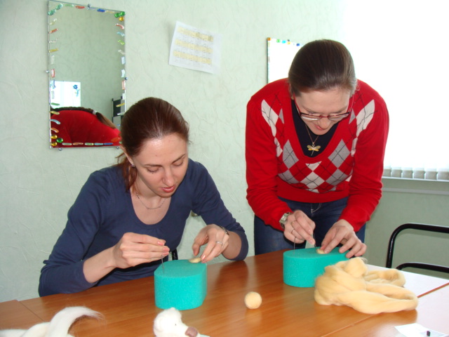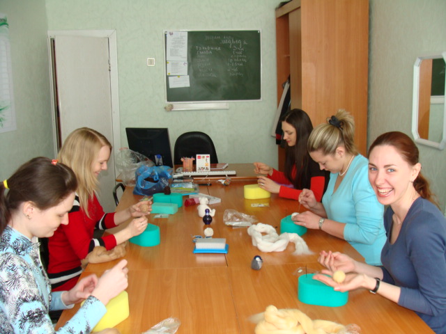 Делали мы там всякое, начиная от декупажа и росписи по стеклу и заканчивая ароматными игрушками и декорированием тканью. Но больше всего меня "зацепили" мишки Тедди и валяние...