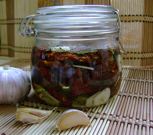 Вяленые помидоры в масле:Берем вяленые-сухие помидоры, чеснок по вкусу ( 3 зубка), свежий розмарин (четыре веточки, без стеблей), майоран или тимьян (на выбор), красный острый перчик, оливковое масло.