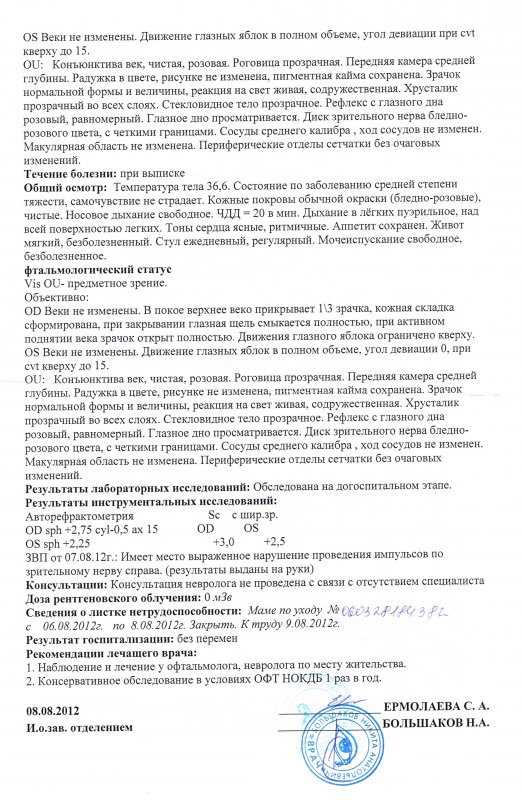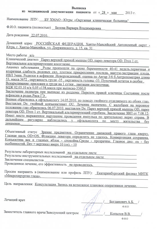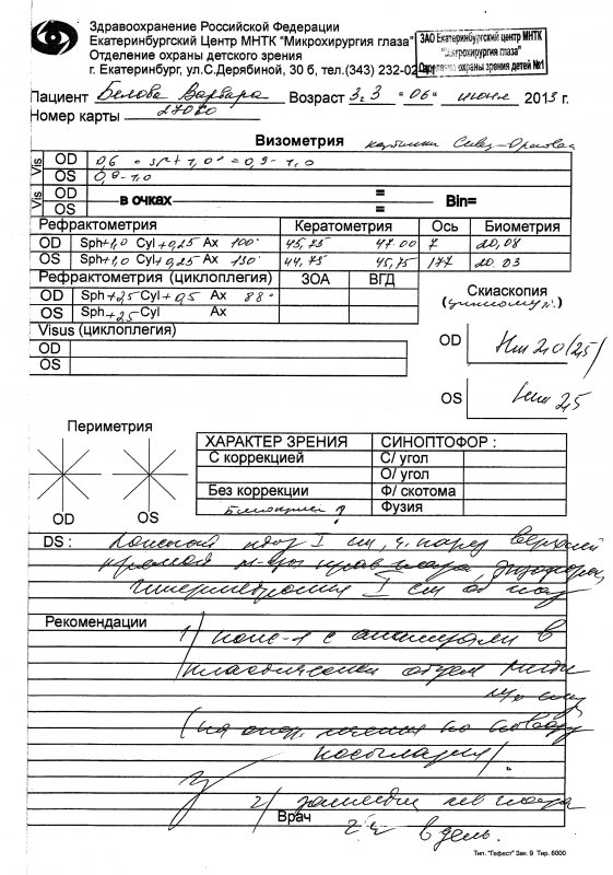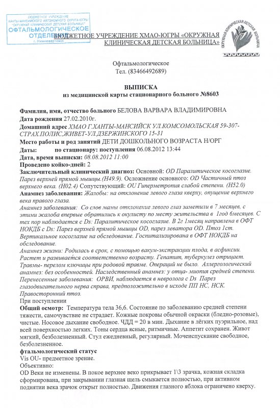 Обращаюсь к Вам за помощью в связи с предстоящей коррекцией косоглазия у моей дочери (возраст 3,5 года). В 2011 году ребенку поставлен диагноз «Паралитическое косоглазие». На сегодняшний день диагноз невролога «Парез верхней прямой мышцы глаза справа. Птоз справа. Пирамидная недостаточность легкой степени»; диагноз офтальмолога «Ложный птоз I степени. Частичный парез верхней прямой мышцы правого глаза. Экзофория. Гиперметропия I степени обоих глаз».
