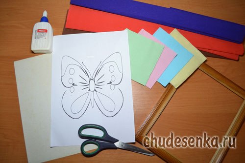 Для начала подготовим основу аппликации: на альбомном листе формата А4 – рисуем любой крупный рисунок, если есть возможность, то можно скачать с Интерента рисунок для раскрасок и распечатать его на принтере. Мы возьмем рисунок бабочки