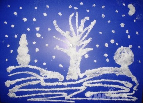 На листе темного картона клеем ПВА рисуем картину. Сверху посыпаем солью. Ждем, когда все высохнет. Остатки соли стряхиваем над раковиной или ванной.
