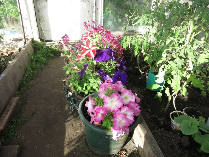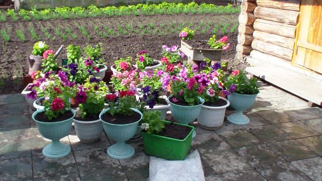 Так как в этом году петунии позамерзали и на все кашпо их не хватило, использовали "подручные" растения