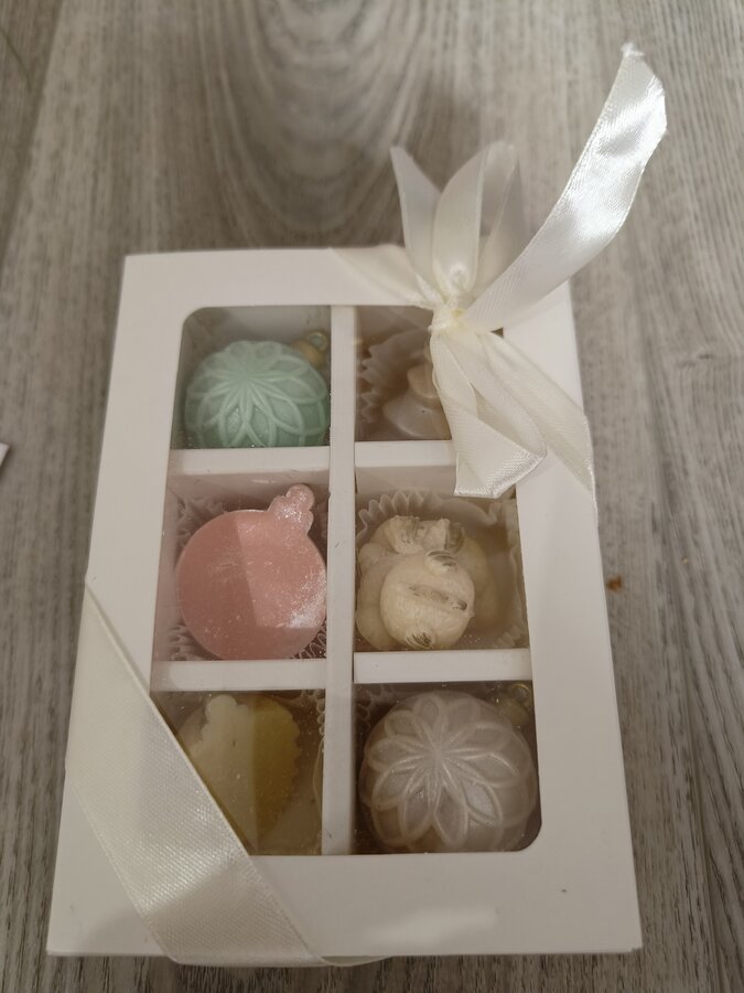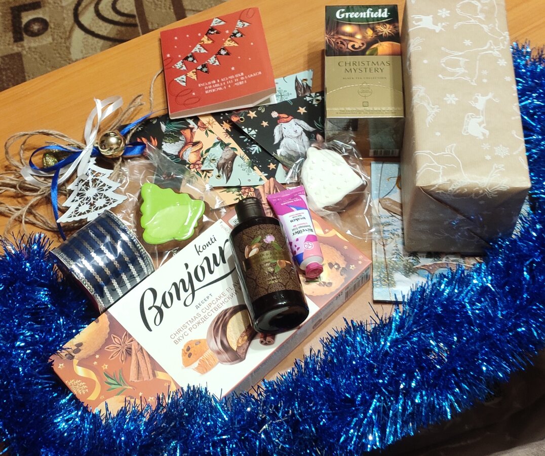 В красивой коробочке с Дедом Морозом оказался целый клад: светящиеся наклейки на окно, маски для лица (буду на Новый год красивой :give_heart: ), мыло (это же мыло? :oops:) в виде аппетитного куска пирога :in_love: , коробочка моих любимых рафаэлло и вкусняшка для кота
