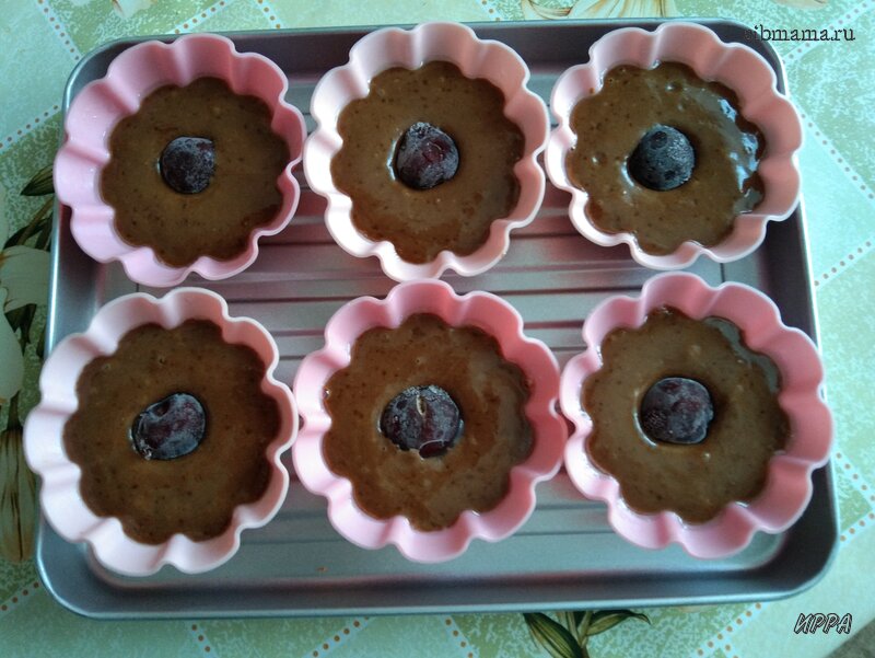 3. Формочки смазываю маслом, раскладываю в них тесто. Сегодня ещё положила в центр замороженную черешню
