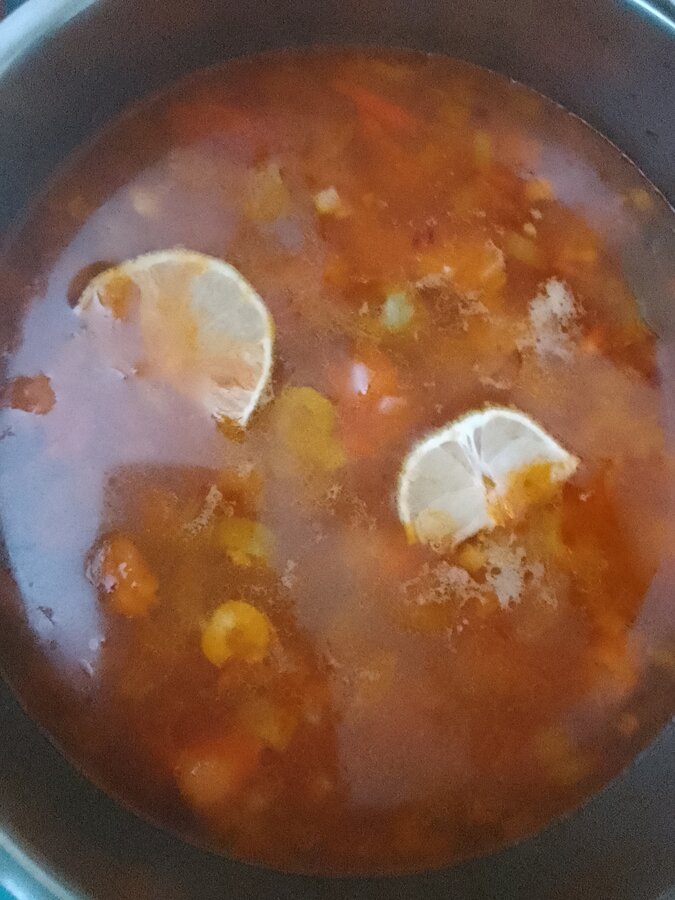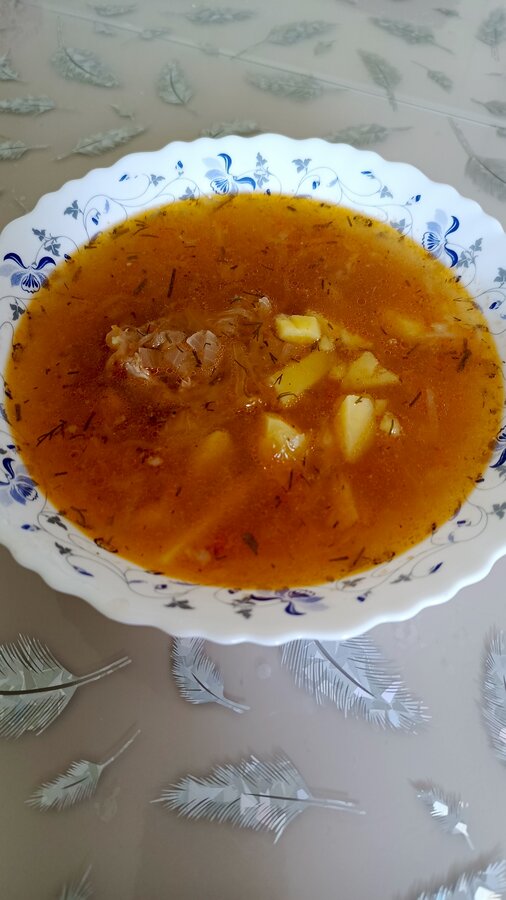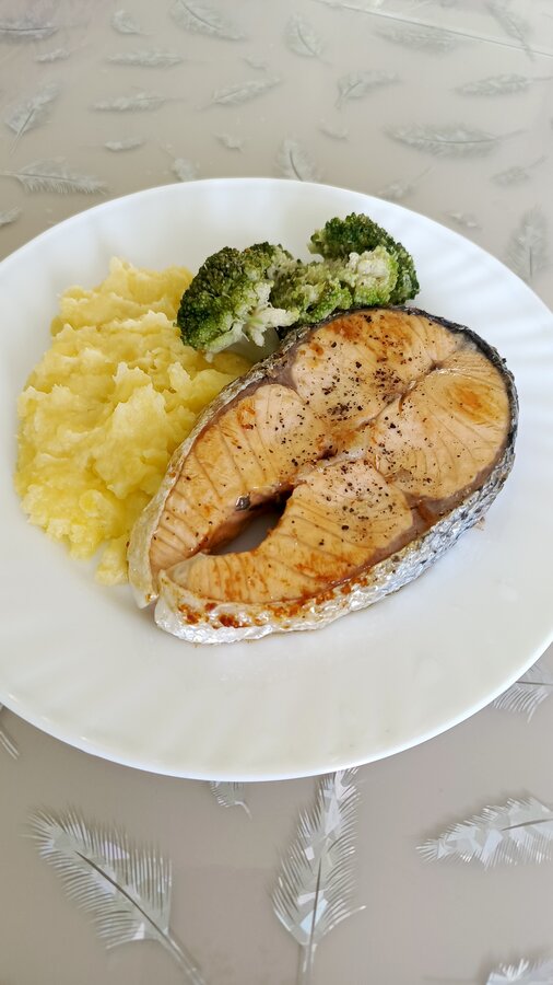 Щи, жареная фасоль с луком, стеки лосося с картофельным пюре и брокколи