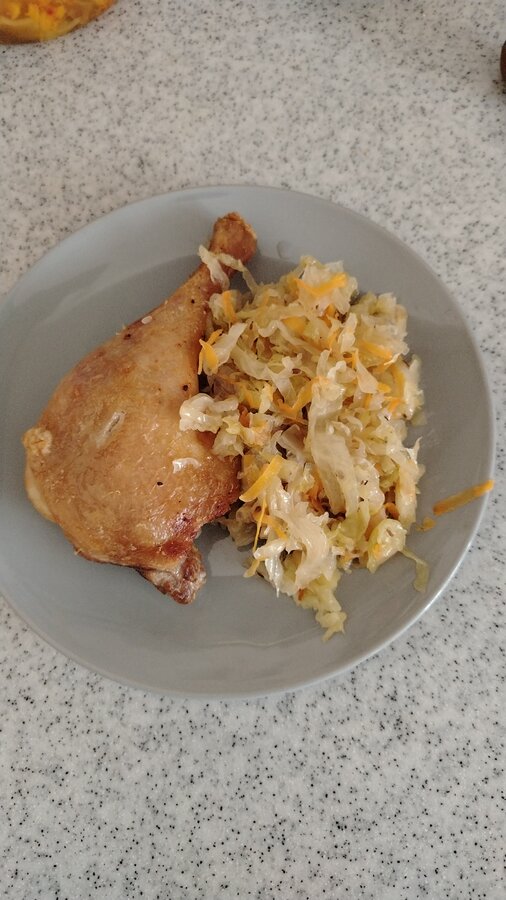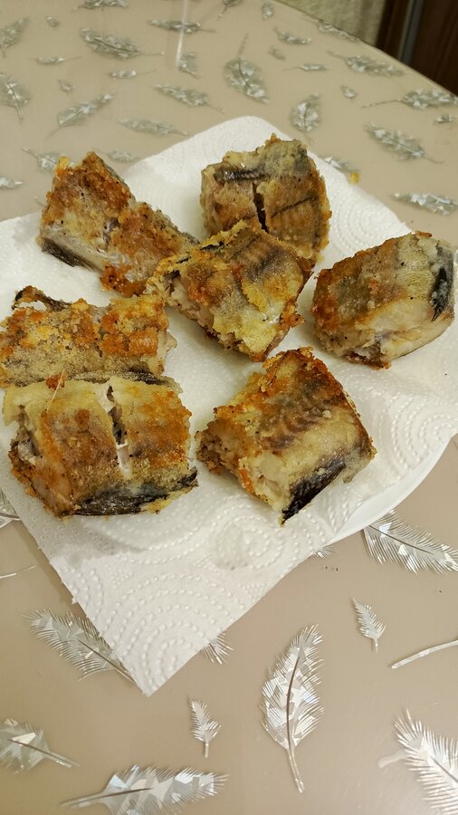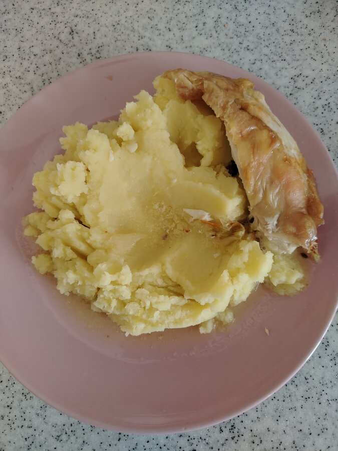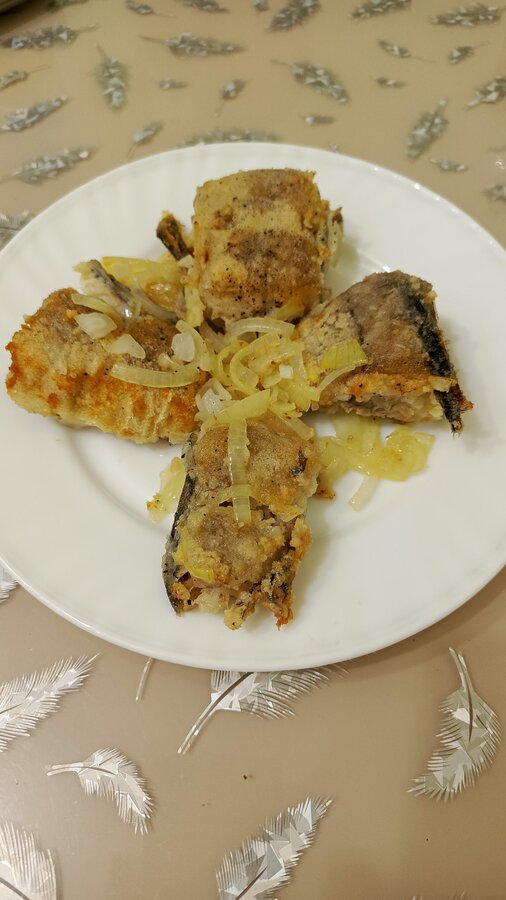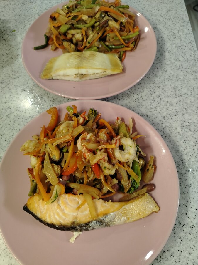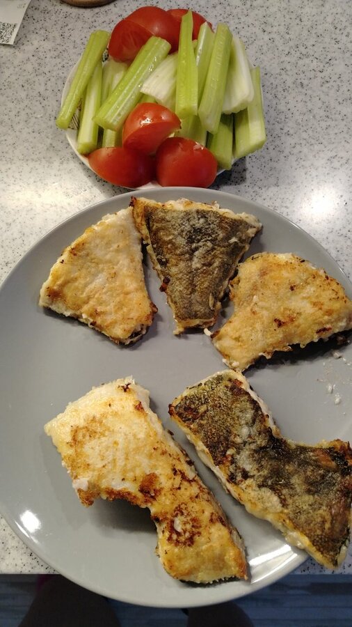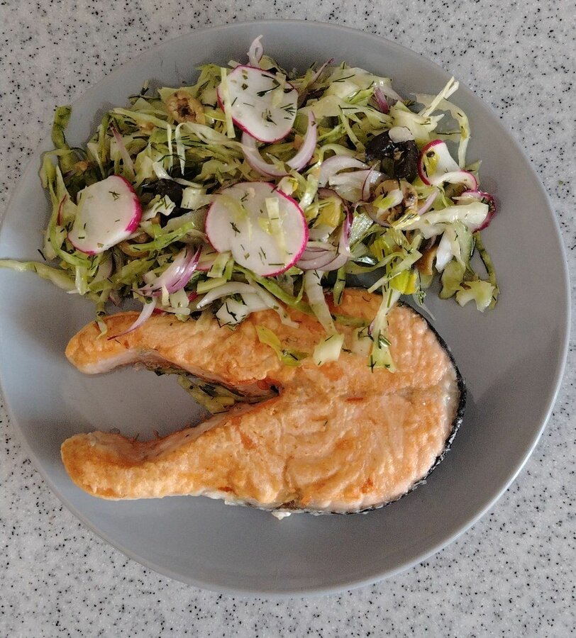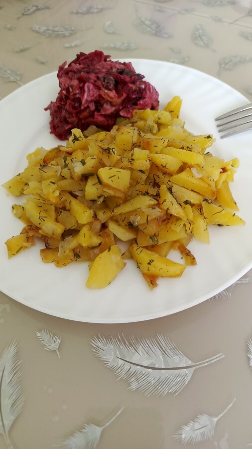 Жареная картошка с салатом ( свекла, чернослив, грецкий орех), жареный минтай, в последнюю порцию добавила лук.
