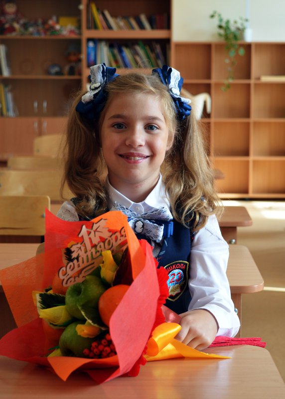 Мы в первом классе дарили букет из конфет, во втором из фруктов, а сейчас из мыла заказала :-D