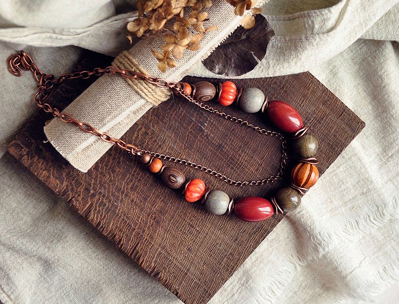 Покупаю бижутерию ручной работы из поделочных, полудрагоценных камней, дерева, керамики. В основном, комплекты. Вот одно из последних приобретений - теплые, немного фольклорные бусы.