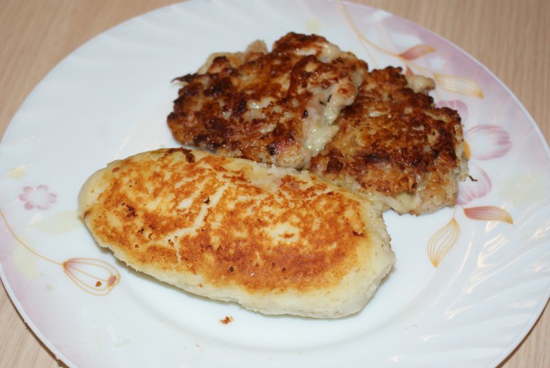 у нас на ужин были куриные котлеты ( курица+ лук+яйцо, поджаренные на сковородке , как оладушки) + картофельное пюре в оригинальном исполнении ( внутрь положила лук+капуста обжаренные, и всю эту зразу поджарила на сковородке, делала конечно не специально, а из серии вариации на тему оставшегося вчерашнего пюре, к картофельной зразе хорошо сметана подходит для соуса )