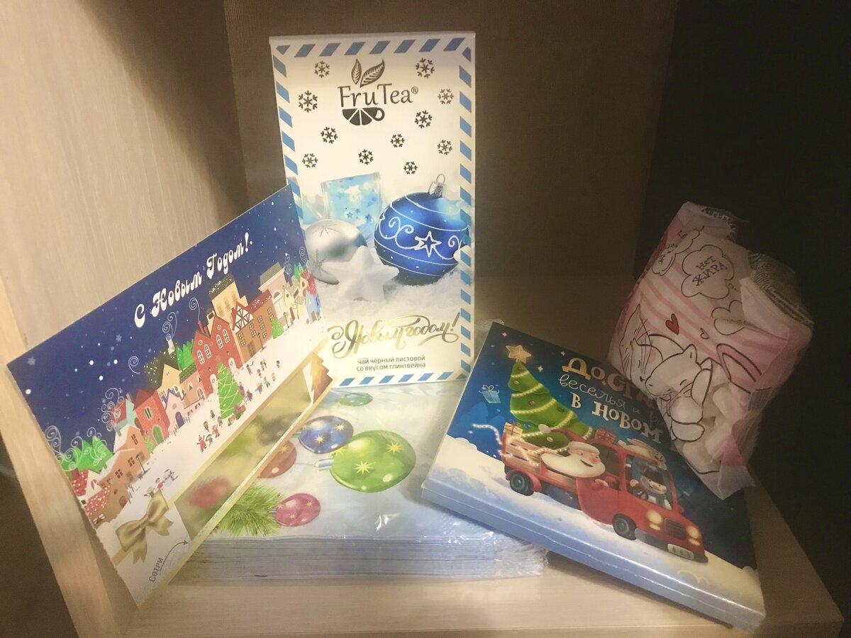 А в нём конфетки, новогодние полотенца и вкусный чаек ( судя по названиям).