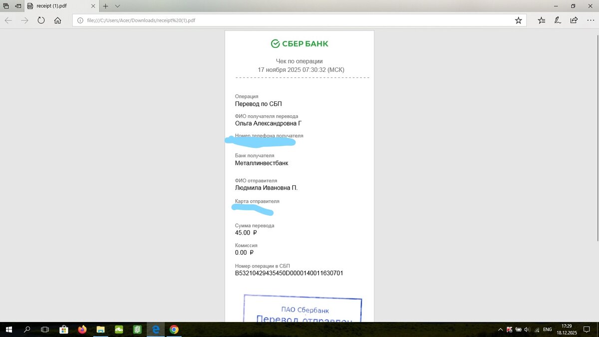 Скрин чека от 17.11 направила на ватсап (висит не просмотренный с 16.12) переживаю.