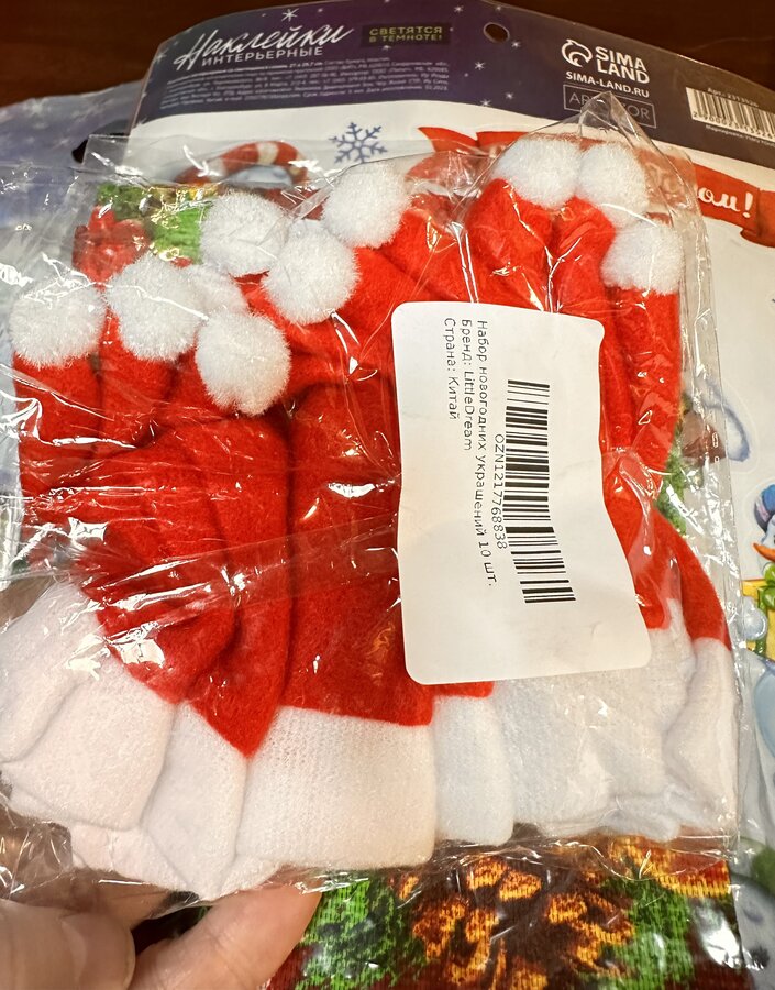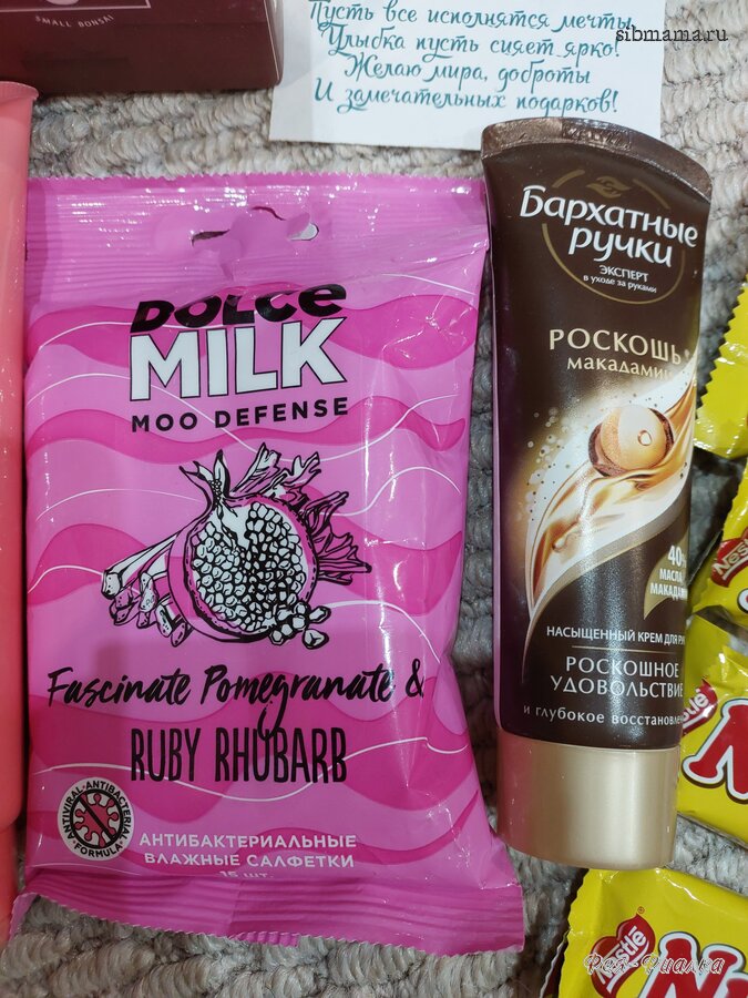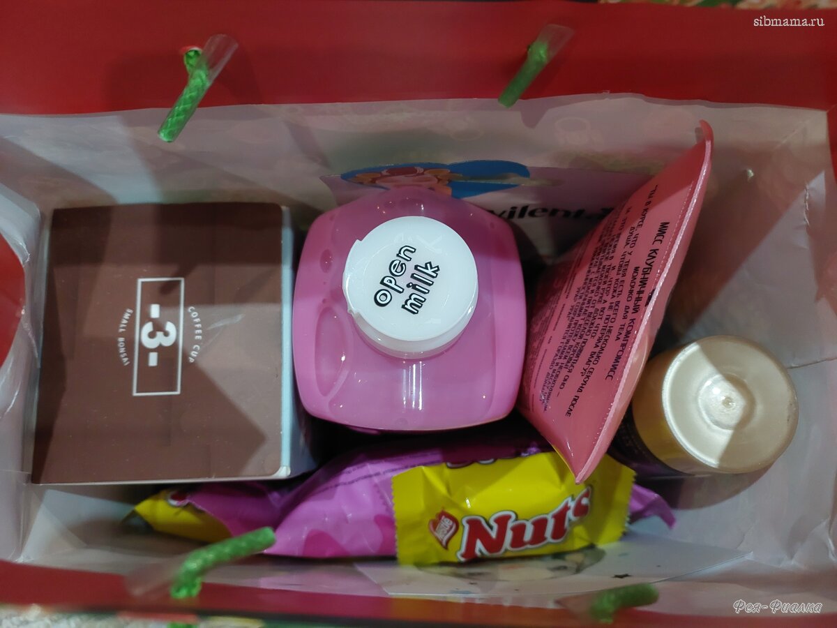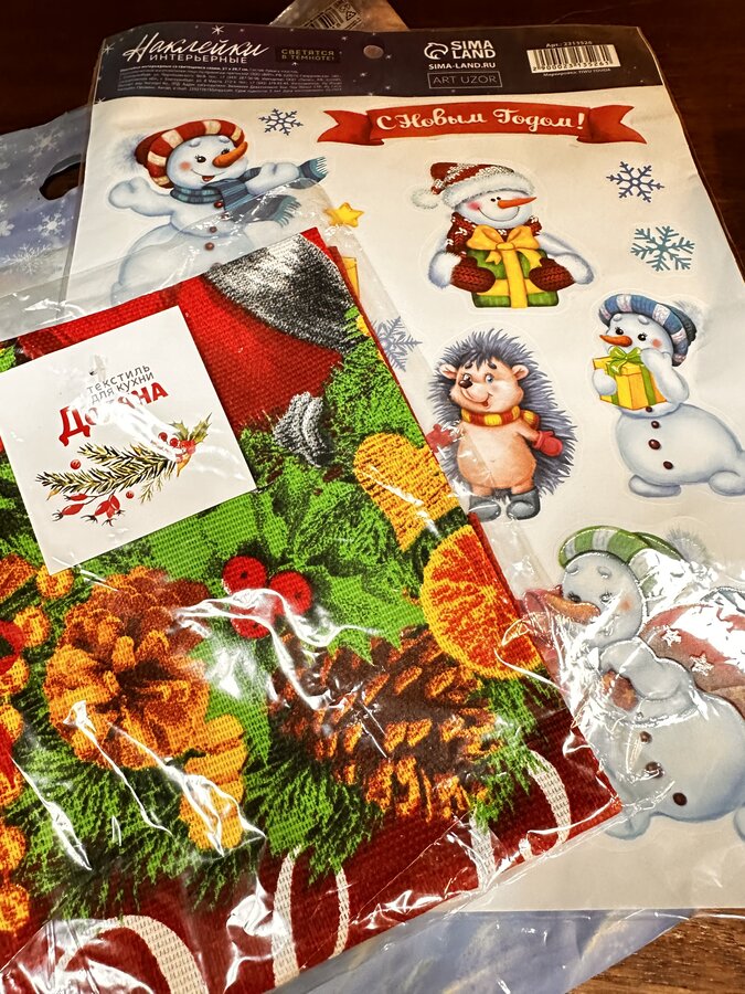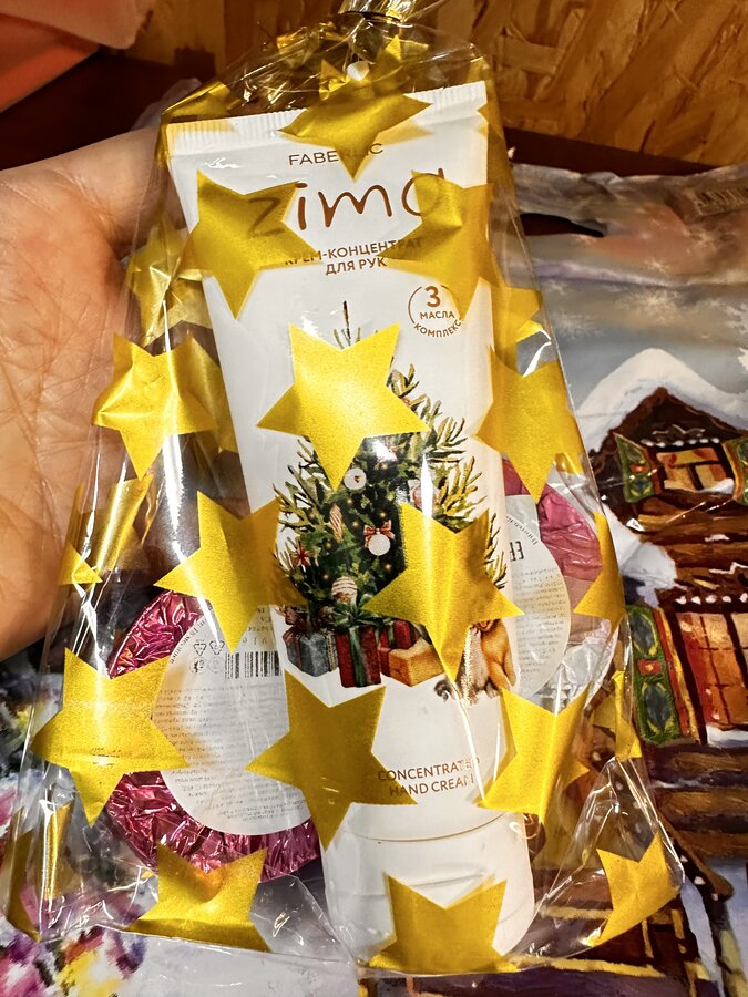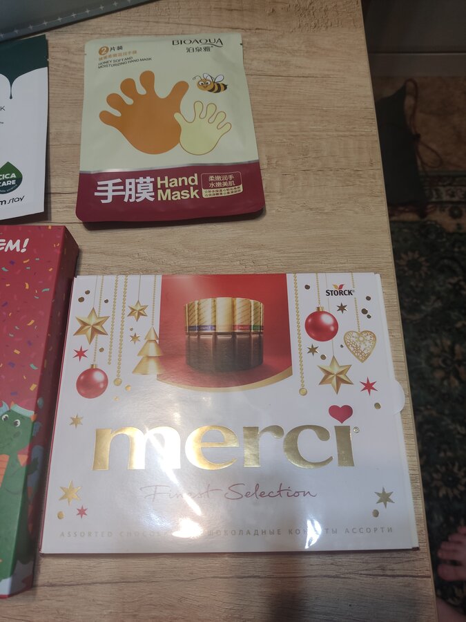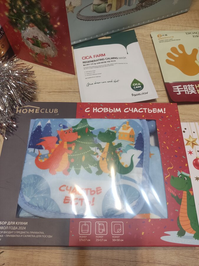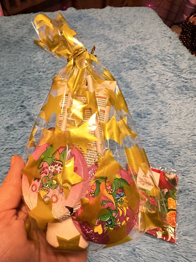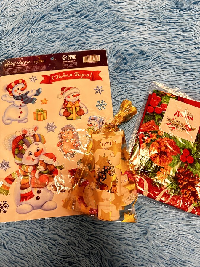 Там лежали классные наклейки ( светящиеся в темноте), кремик для рук со сладостями и новогоднее полотенчико