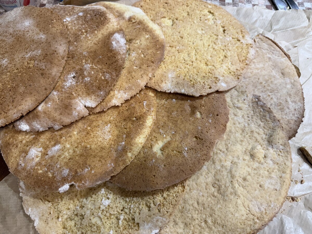 Каждый корж выпекала при 180 гр мин по 25 ( зависит от диаметра формы и духовки), горбатые верхушки срезала, измельчила в блендере на крошку