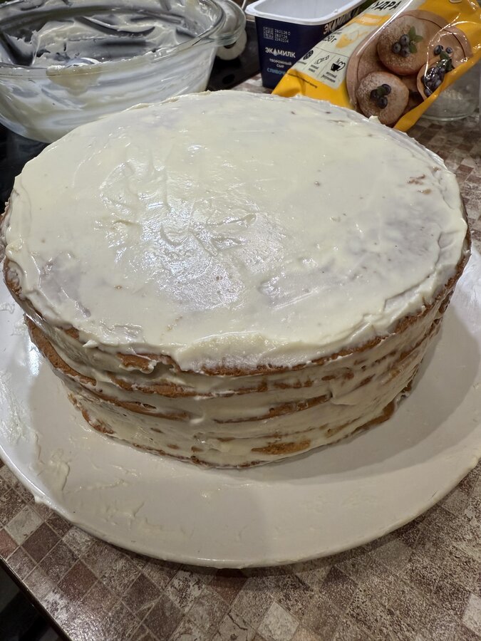 Украсила кремом из творожного сыра 350-400 + взбитые сливки 33%-250 где- то и сахарная пудра . Я делаю и смотрю консистенцию , поэтому точно не взвешивала.
