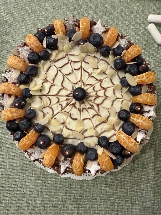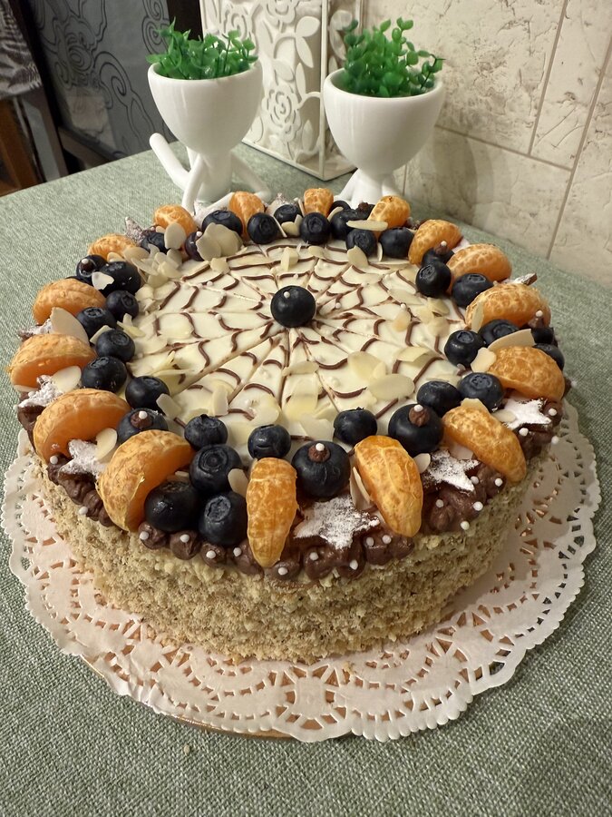 Украсила дольками марокканских мандарин ( вкус у них 👍), голубикой ,миндальными лепестками , + звездочки из яблочной пастилы , посыпки