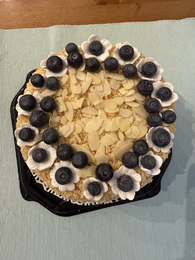 Глазурью не стала сверху украшать , были заранее сделаны цветочки из мастики, голубика и миндальные лепестки( очень выручают)