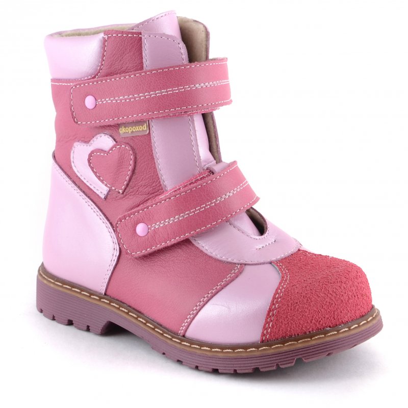Классные новые сапожки СКОРОХОД. Отличные сапожки их натуральной кожи с красивым сочетанием розовых тонов, декорированы сердечком. Крепление на липучке (велкро) позволяет удобно фиксировать ногу по объему и полноте. Выполнена защита носочной части от намокания и сбивания натуральной кожей "Матрикс".