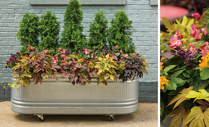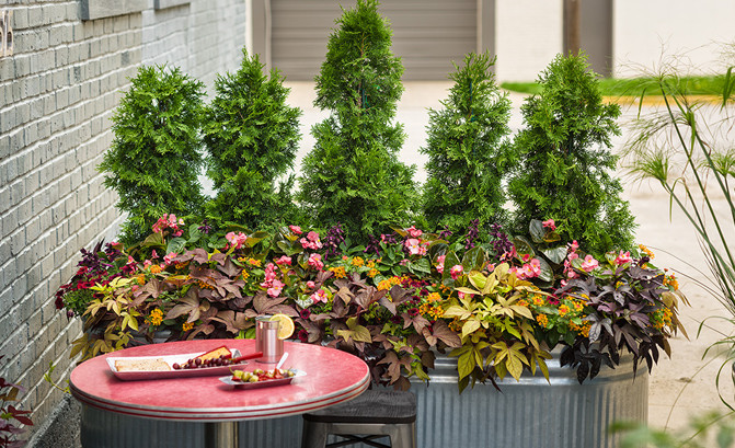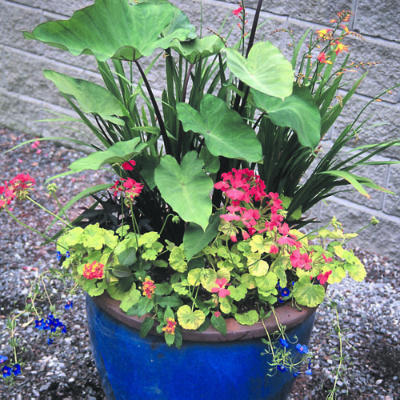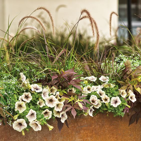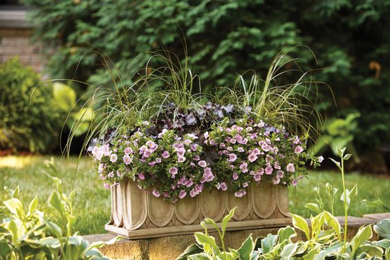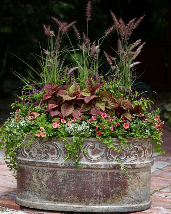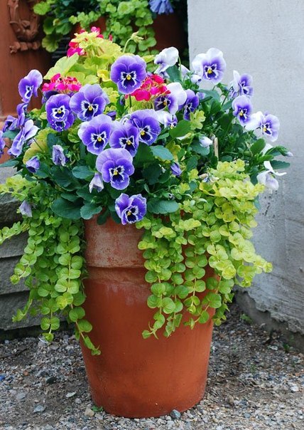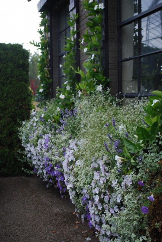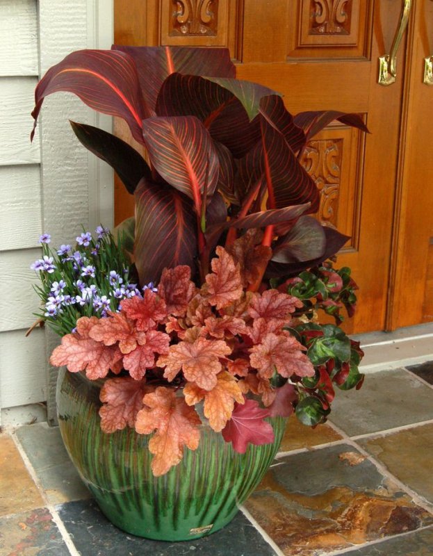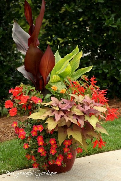 Всем здравствуйте! :-) В предверии лета насохраняла фото миксов, поделюсь :-) Старалась выбрать такие, где большинство-это известные нам растения, может быть случайно повторю уже здесь размещенные фотографии. Еще в этом году надумала, что миксовать то можно и с домашними растениями, типа сингониума, хлорофитума,трандесканции, сансивьерии :-)Нравится мне так же алоказия, но дома ее сейчас не держу, а так бы отвезла на дачу и попыталась замиксовать..Если у кого-то уже был опыт, подобного рода миксов, здорово если расскажете.Нравятся канны в горшках, и луковичные, которые создают вертикали.