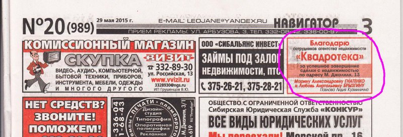 Это не рекламный ход, не "маскировка под реальный отзыв" - клиент по своему желанию поблагодарил через газету своего риэлтера.