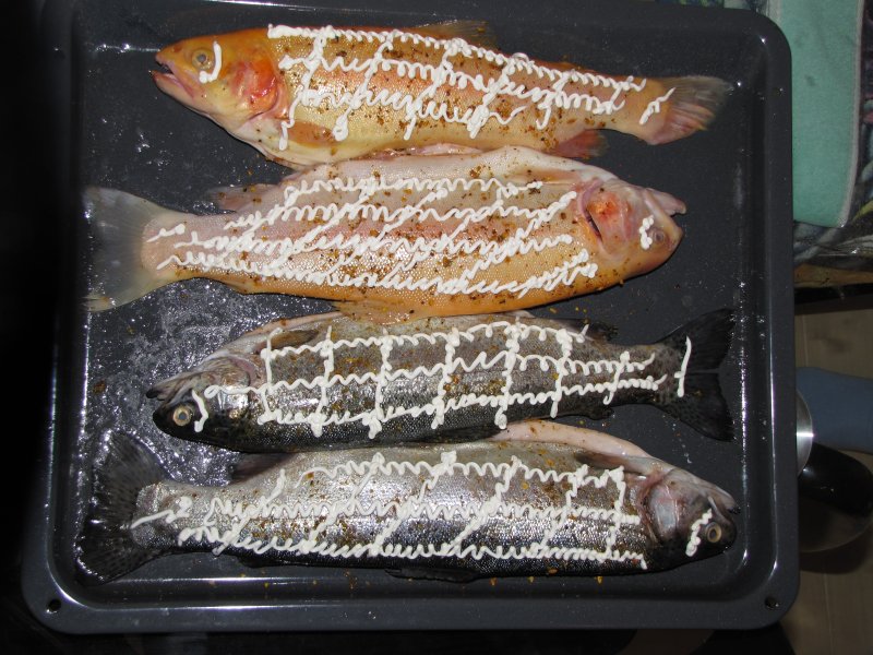 а мы тут пока живем подсели на рыбу с местного форелевого хозяйства. Такой форели еще не ела вкусняцкой...Это не та форель, что в Омске продается, с красным мясом, замороженная...а другая...свежачок, выращенный на хоз-ве, его как правило не морозят, поэтому никуда не возят на продажу...Покупаем мы обычно прямо живую рыбку, так как потрошенка стоит дороже...Чиститься она мгновенно...готовится также...никаких маринадов и супер приправ, дабы не испортить благородный нежнейший вкус ее мяска....Мясо у речной форели белое, и размеров она небольших....достаточно жирненькая. На фотках два вида, золотистым цветом - "янтарная" форель, серенькая - "радужная", так как переливается она красиво.