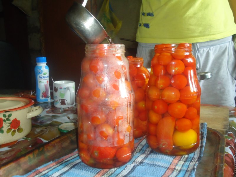 помидоры плотно уложить в стерилизованные банки.