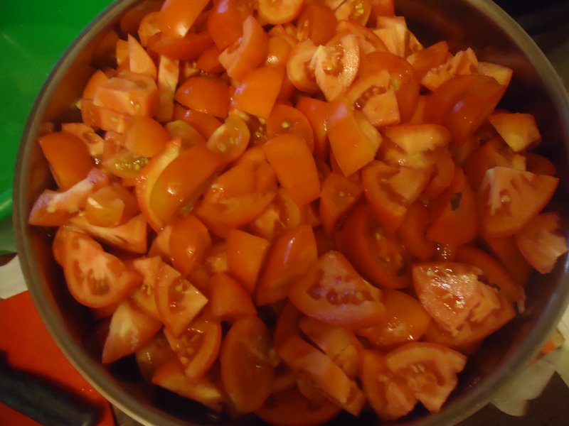 Режем 3 кг. помидор в чистом виде крупно, хоть на пополам, на четвертинки (Чтобы влезло в кастрюлю. У меня на 10 литров.)