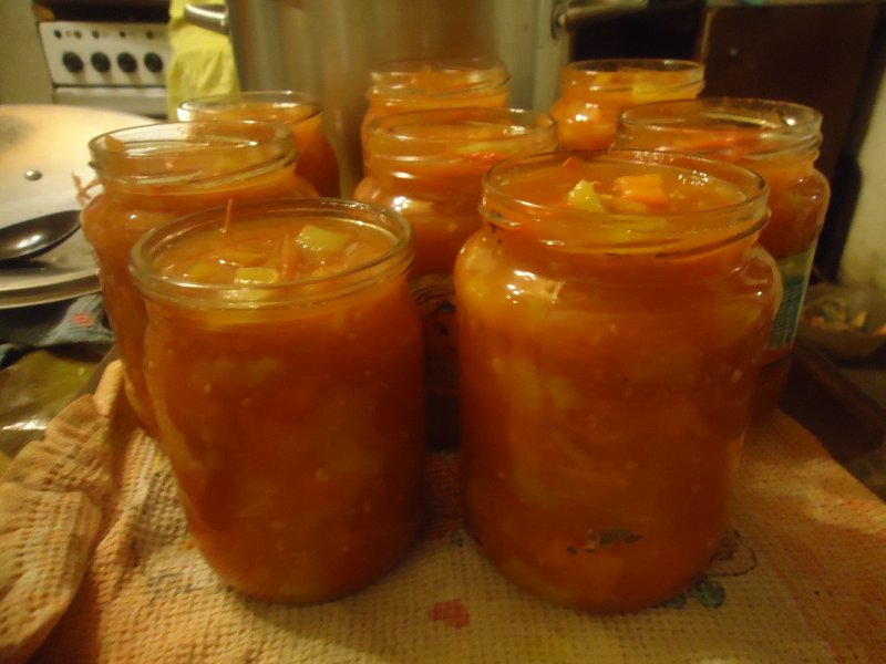 2 кг помидор пере крутить через мясорубку, 25 шт перца( 2кг) порезать (3*3) . Помидоры поставить на огонь и туда же перцы , 1 ст. Сахара, 1ст. Растительного масла , 1 ст. Л. С горкой соли, 2 головки чеснока ( можно 1). Кипятить. 25 минут, разлить , закатать, поставить под шубу. В 5 литровую кастрюли все входит нормально. Получается сладкое лечо)) |