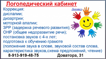 "Логопедический кабинет"на Доватора, 31 приглашает на индивидуальные занятия детей с 2-х лет. Подготовка к школе с 5 лет. Продолжительность занятий 30 мин, стоимость 700 руб. Запись в сообщениях или по WhatsApp.Есть два свободных места