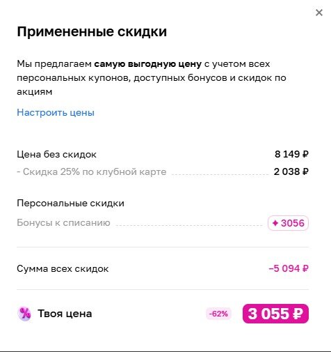 Играла с корзиной Лету. Туда сюда кидала флаконы, активировала и убирала промокоды. Цена корзины 4400, в какой-то момент после моих манипуляций стала 3800. Ну, я обрадовалась, давай жать кнопку "Оплатить". Мне говорят: "Ой, информация о бонусах изменилась, обновите страницу". Обновляю, получается 3500. Изумляюсь. Жму "оплатить". На странице ввода карты сумма внезапно 8800.