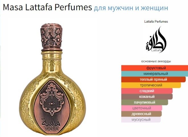 это аромат для мужчин и женщин, он принадлежит к группе цветочные фруктовые. Это новое издание: Masa выпущен в 2023 году. Верхние ноты: Манго, Шафран, Розовый перец и Лимон; средние ноты: Османтус, Лист фиалки, Цветок апельсина и Имбирь; базовые ноты: Минеральные ноты, Замша, Пачули и Амбра.