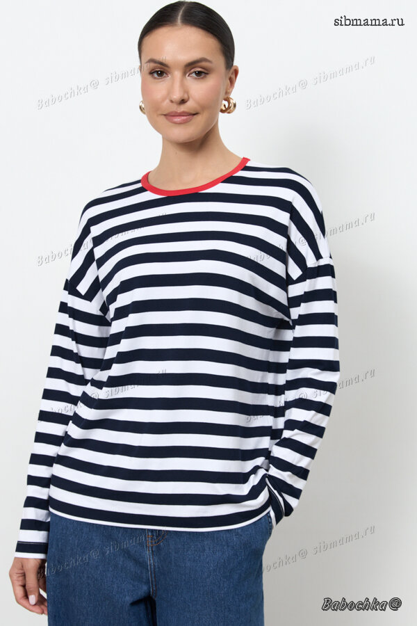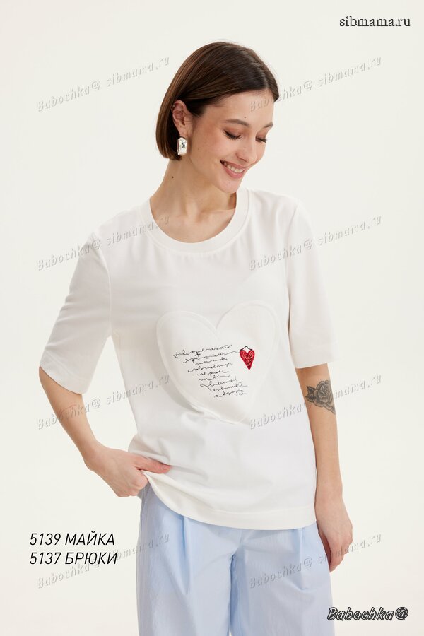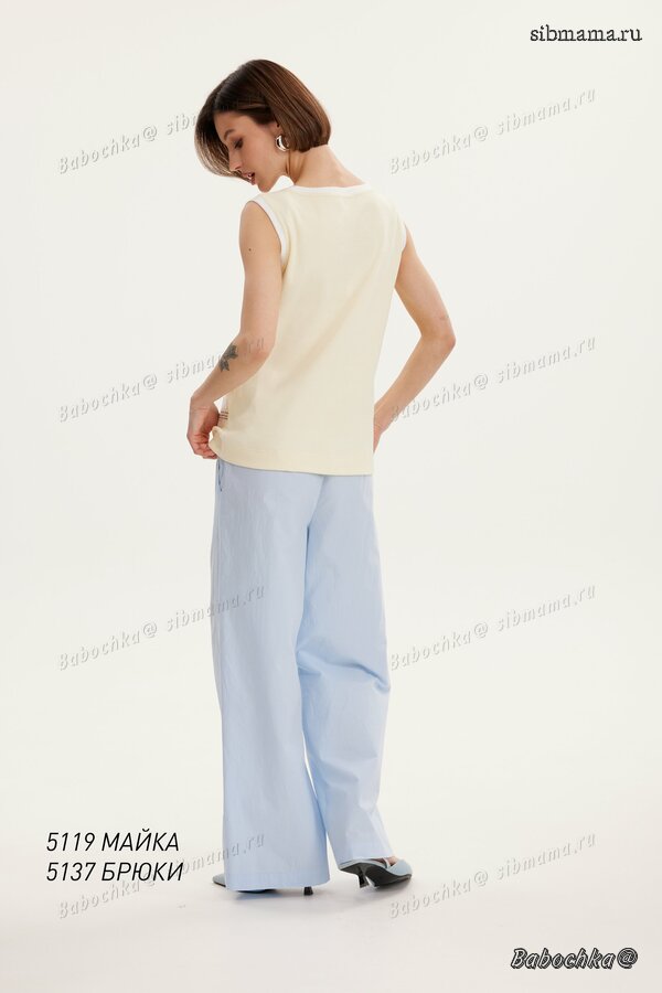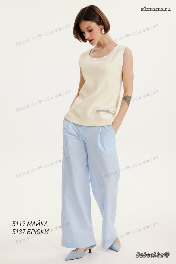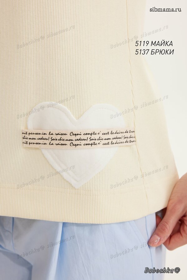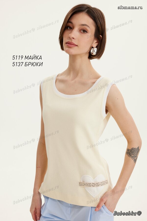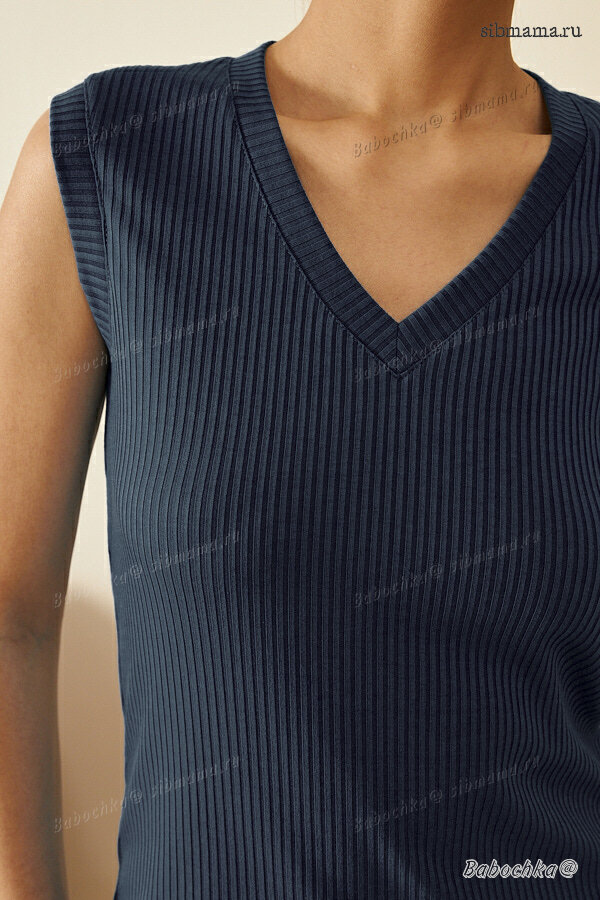 , из хлопкового трикотажного полотна. Горловина и пройма оформлена тесьмой-довязом. Перед модели декорирован стильным дизайнерским дэкором ."