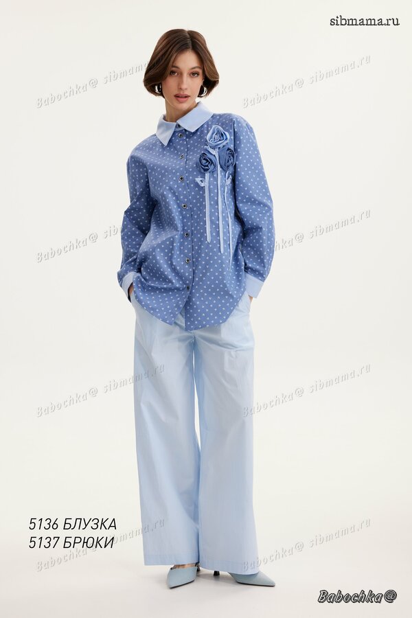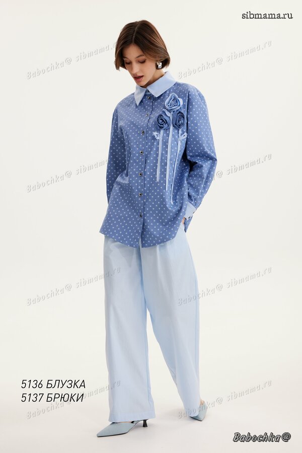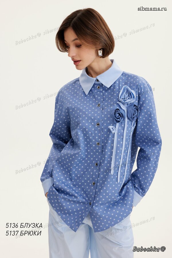 Рубашка из французского хлопка , прямого силуэта с фигурным низом . Выполнена застежка на петли и пуговицы. По горловине стояче-отложной воротник с отрезной стойкой. По спинке кокетка и склада на свободу движения. Рукав рубашечного кроя. Перед блузки декорирован дизайнерским дэкором .