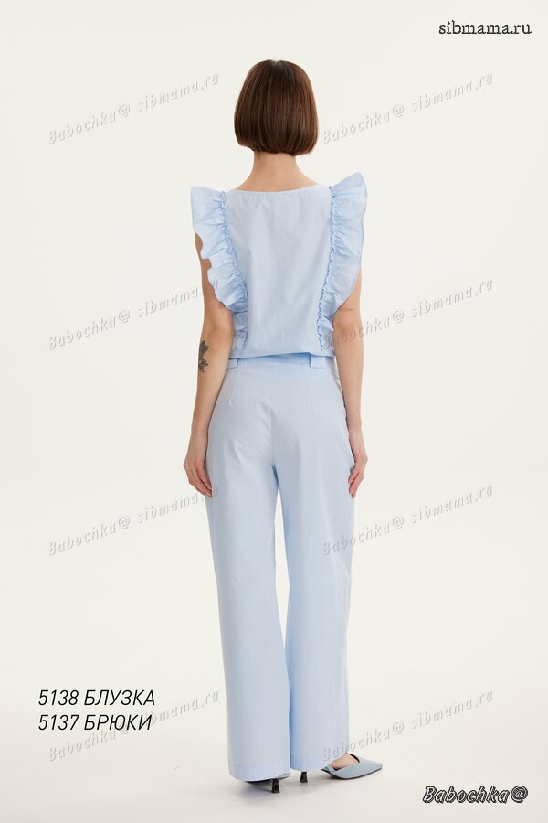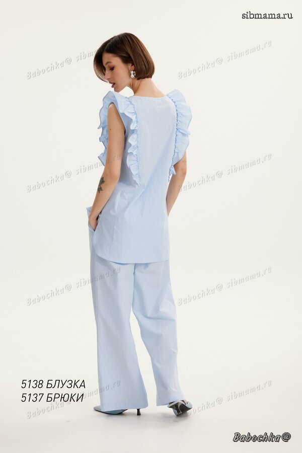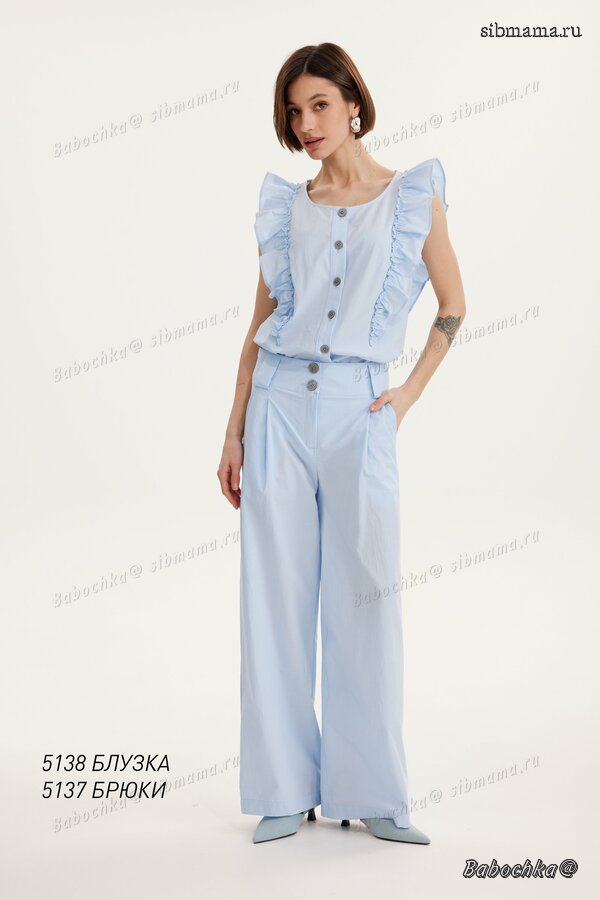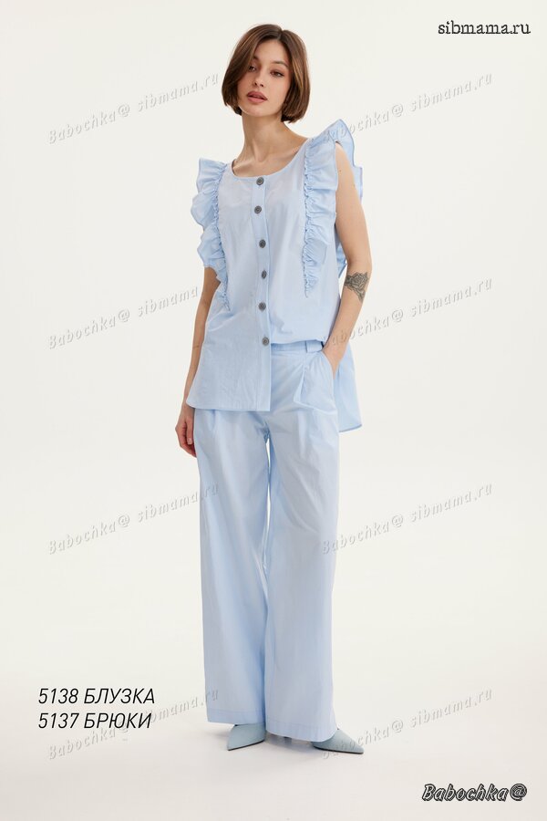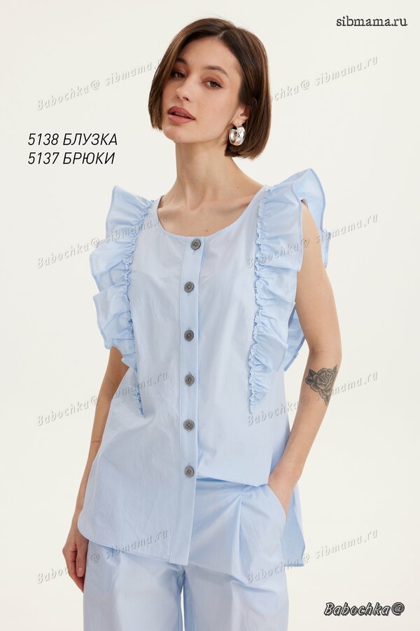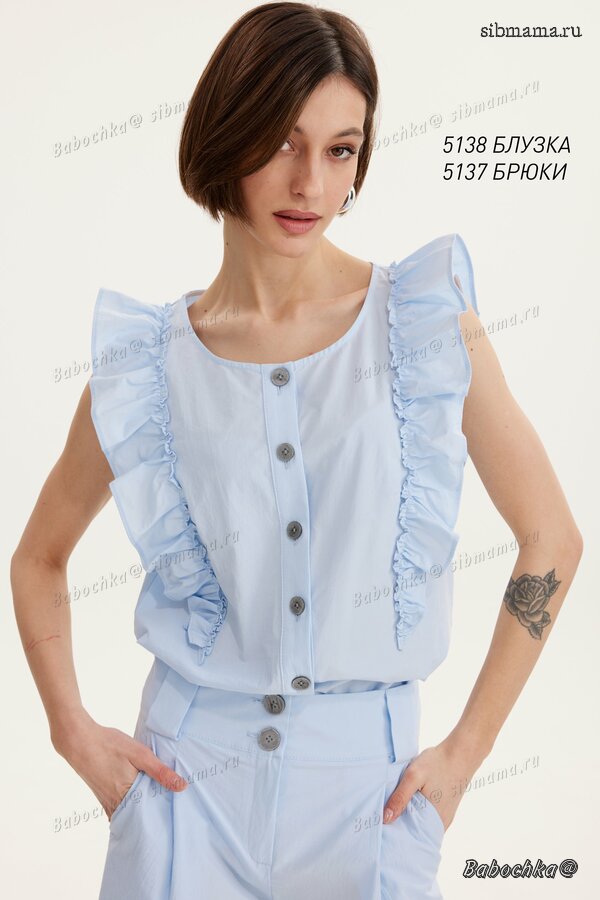 Блуза прямого силуэта с круглым вырезом горловины. По горловине и пройме окантовка. Низ изделия фигурный. По переду планка , застёгиваеться на петли и пуговицы . Перед и спинка модели декорированы валанами .