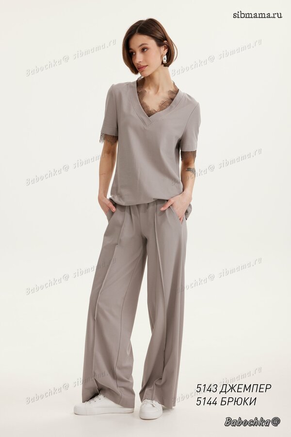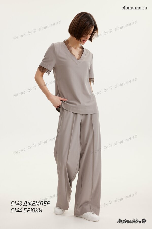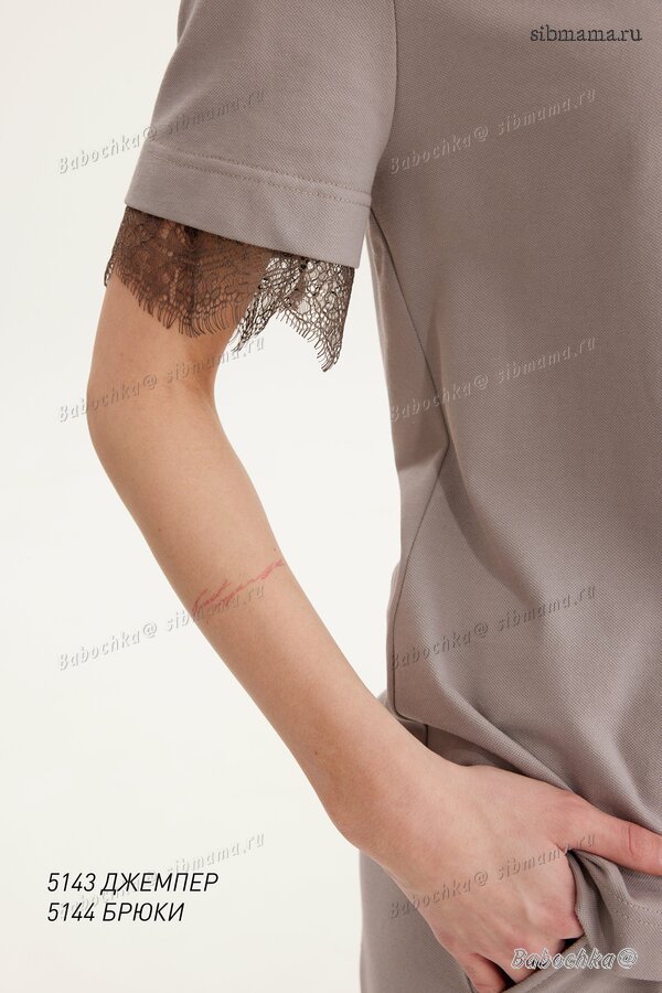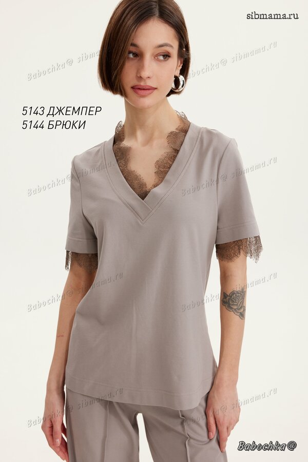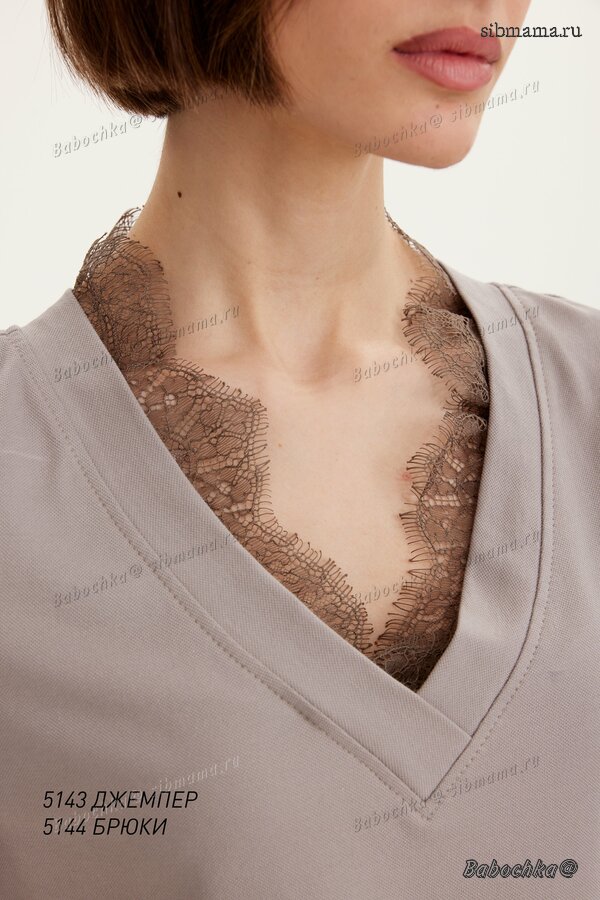 Стильный джемпер из трикотажного полотна. Горловина с V – образным вырезом, низ рукава и горловина обработаны ажурным кружевом .