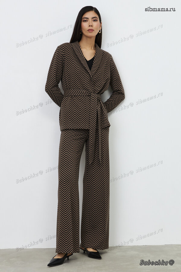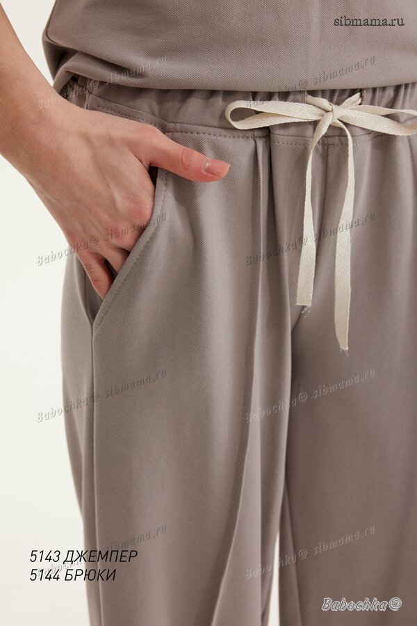 Брюки средней посадки из мягкого трикотажа. В пояс вставлена резинка с регулируемым шнурком. В боковых швах карманы."
