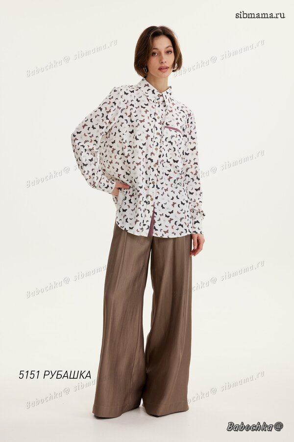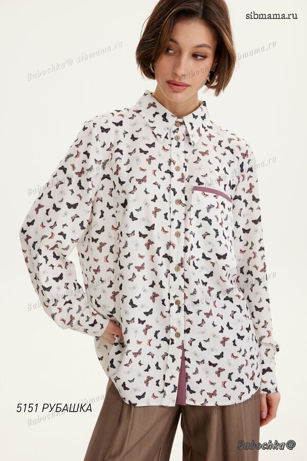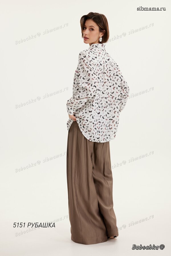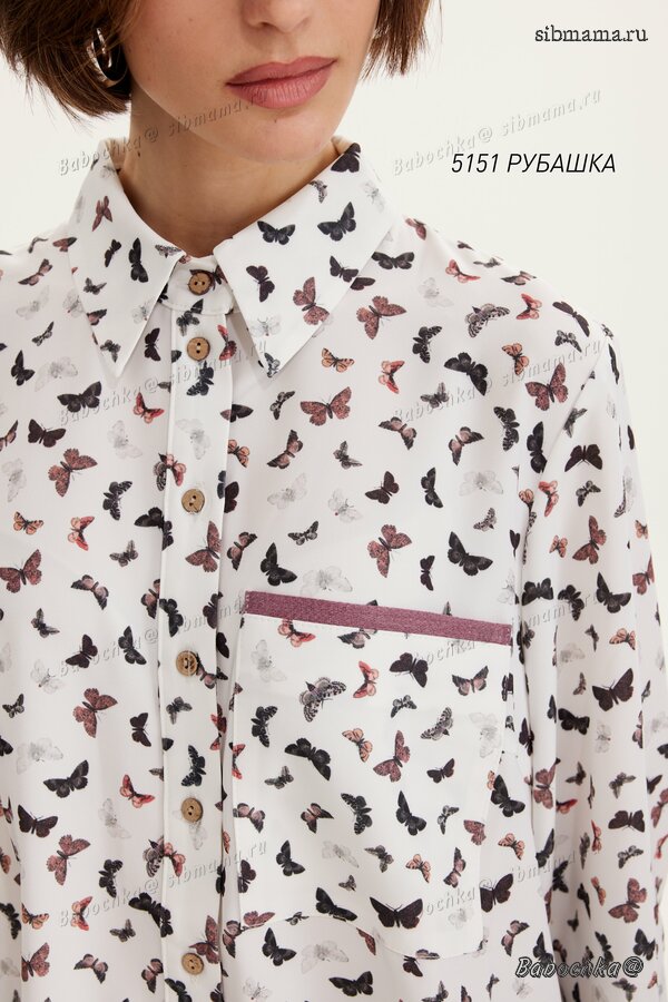 Рубашка прямого силуэта с фигурным низом. Выполнена застежка на петли и пуговицы. По горловине стояче-отложной воротник с отрезной стойкой. По спинке кокетка и склада на свободу движения. Рукав рубашечного кроя с манжетой по низу.