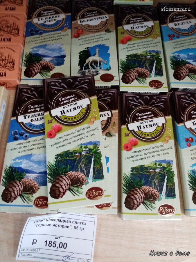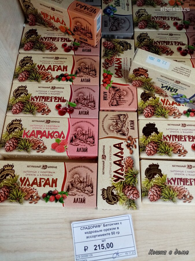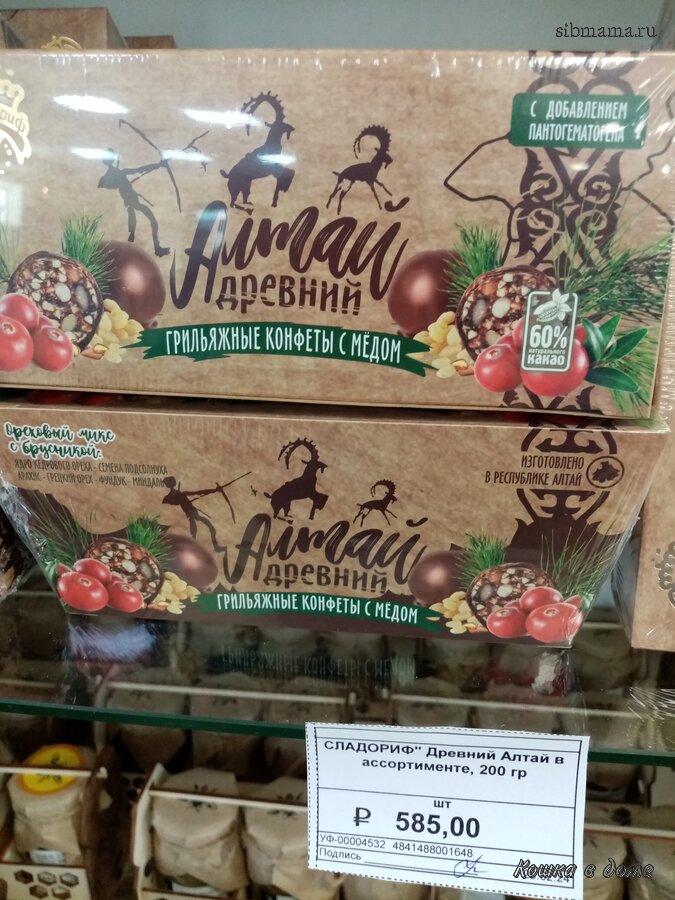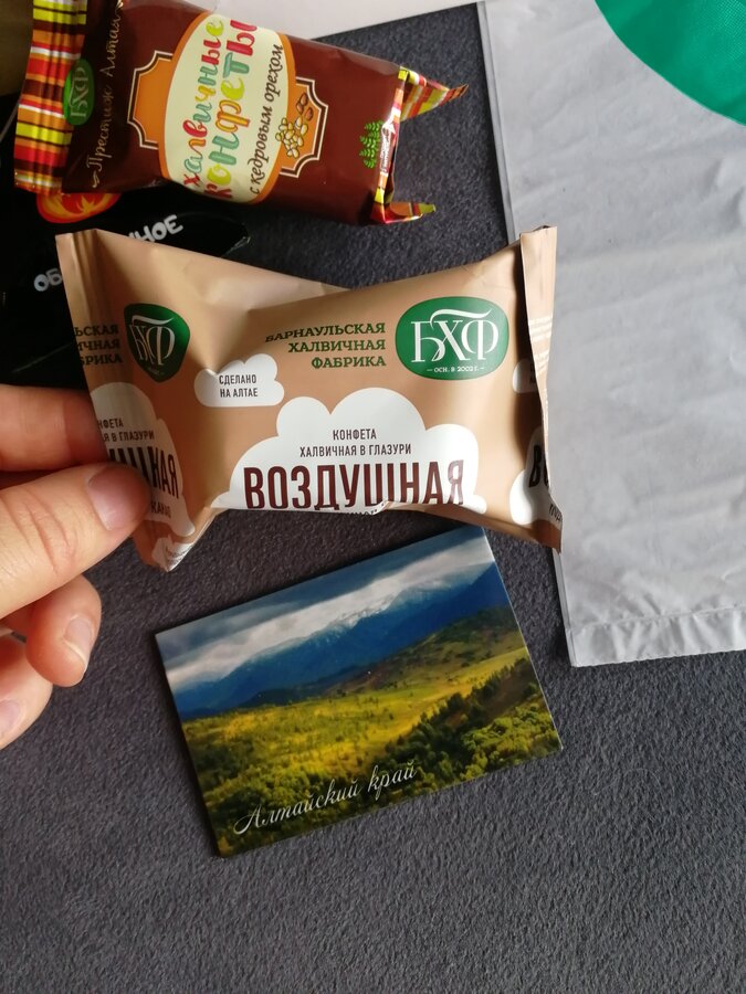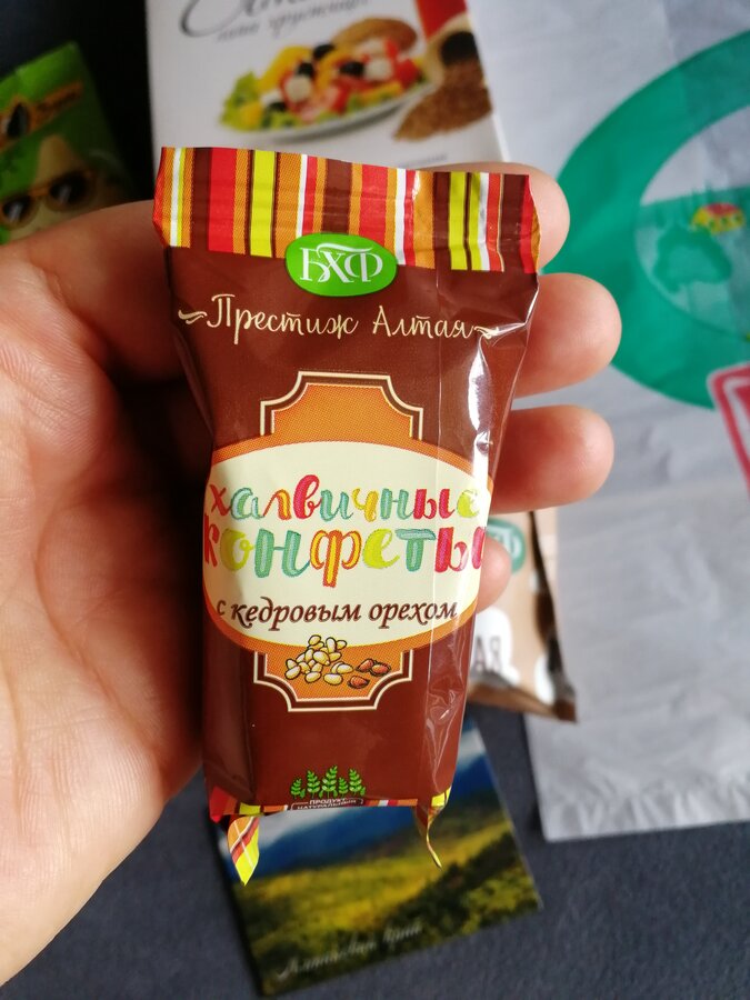 -две конфеты от Барнаульской халвичной фабрики, та что с кедровым орехом по 1000 с чем то за кг, та что обычная по 500 с чем то за кг, я не пробовала ни разу наши конфеты, продегустировали, свежие, вкусные, кто любит халву)) с кедровым орехом - орех вообще не чувствуется, можно было не переплачивать и взять обычные! Глазурь на конфетах тонкая, крошится, внутри конфета не очень красивая, не цельная, а как буд-то ее роняли и она растрескалась((