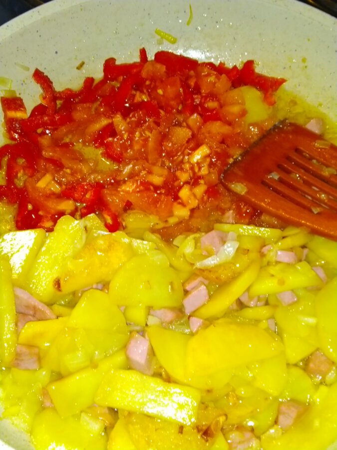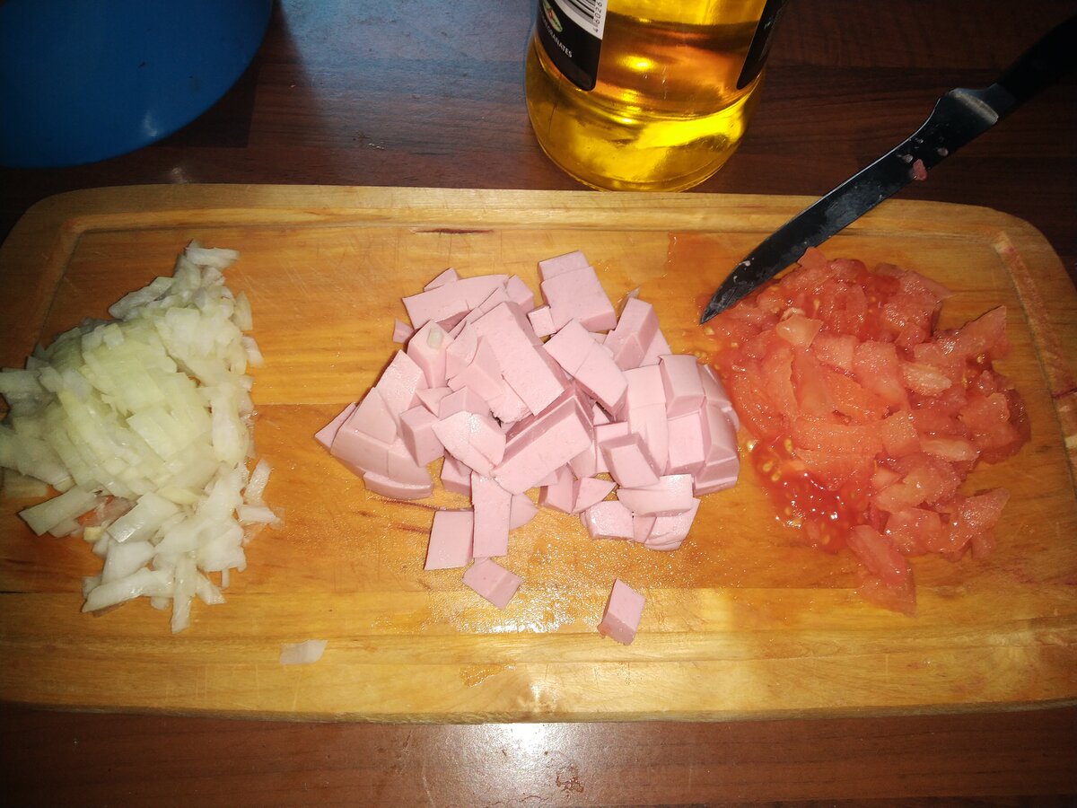 лук, томат без шкурки, колбасу, перец - нарезаем
