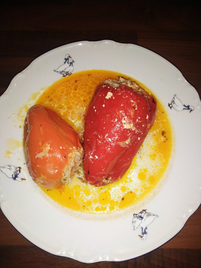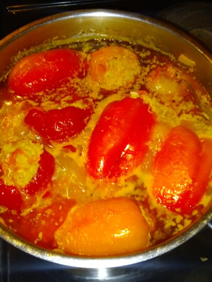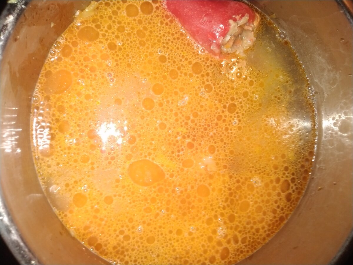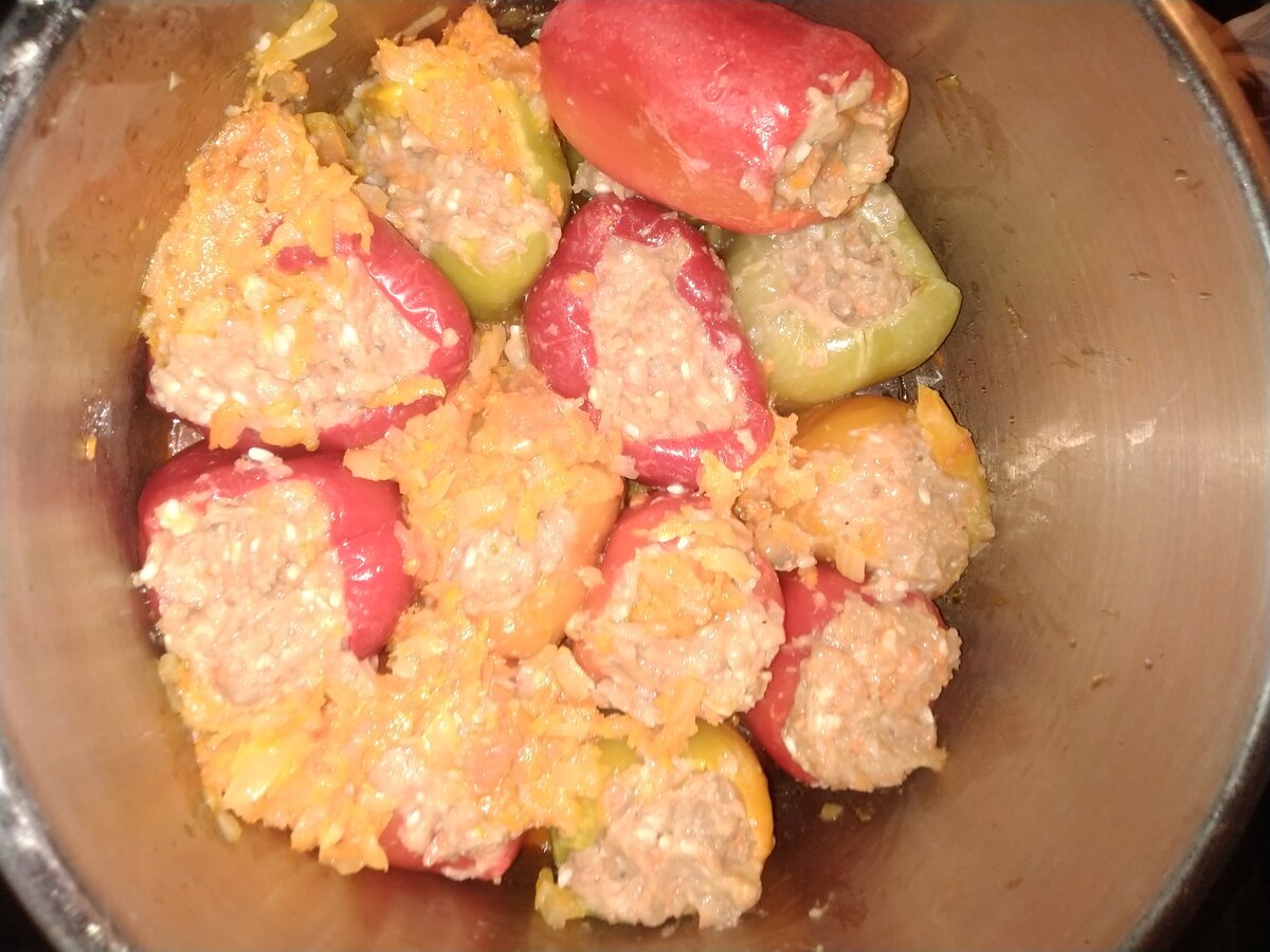хорошо перемешиваем, наполняем перцы, ставим в кастрюлю
