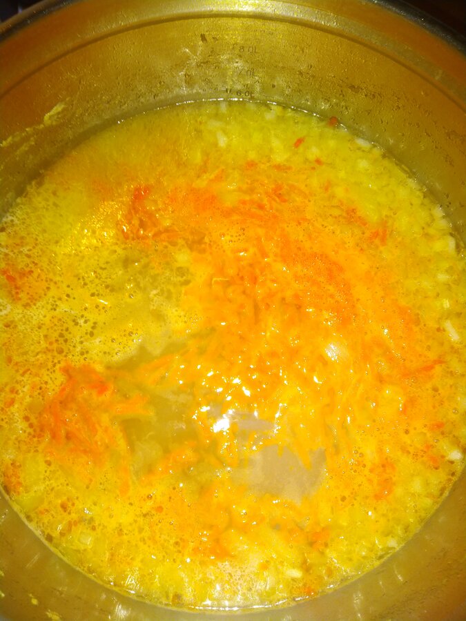 Готовим мясной бульон, после закипания снять пену, добавляю лук и морковь крупными кусками (потом убираю), перец - душистый пару горошин, черный - горошин 7-8.