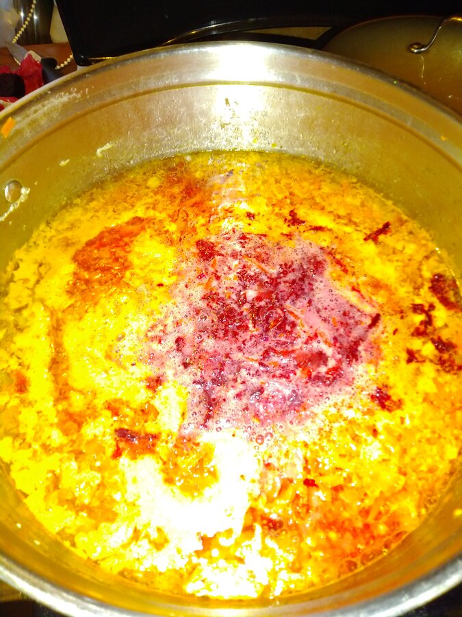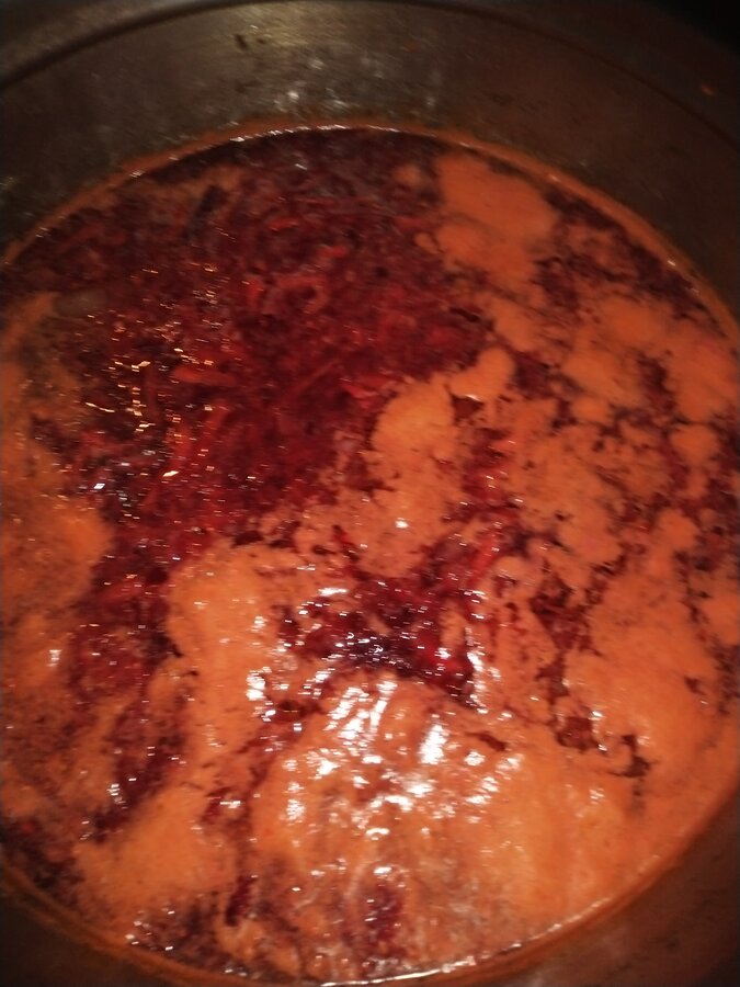 закипит, помидоры уже отдали кислоту для сохранения цвета свеклы, добавляем свеклу - часть кубиками, часть на терке