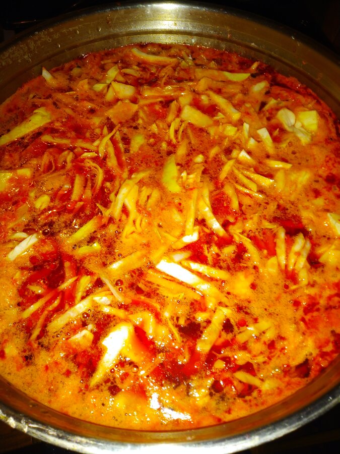 варим на медленном огне до почти готовности капусты, накрываем крышкой, выключаем плиту, оставляем на теплой плите на несколько минут, чтобы капуста дошла до готовности