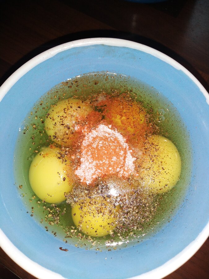 в миску - яйца, соль, перец, паприка - все перемешиваем хорошенько