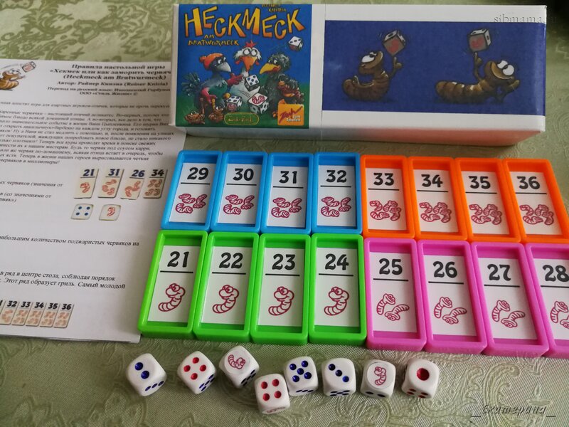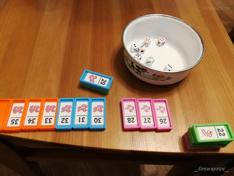 Например, 1 бросок - взял три 5, 2 бросок - взял 2 червяка, 3 бросок - одна 4, этот ход дал 29 очков, с гриля можно взять порцию червяков с рейтингом 29 или ниже. На кубиках обязательно должен быть червяк, если ни разу не удалось взять червячка, то ход считается неудачным. Порции червяков складываются в стопочкой в порядке приобретения, перемешивать стопки нельзя. Бросать кубики можно прекратить в любой момент, но набранных кубиков должно хватить на порцию червяков. Если, при очередном броске, выпали только те цифры, которые уже есть у игрока, то ход считается неудачным. Если суммы не хватило на приобретение порции червяков, то такой ход тоже считается неудачным. При неудачном ходе верхняя порция возвращается на гриль, а порция с самым большим рейтингом переворачивается и больше не участвует в игре. Если на гриль возвращается порция с наибольшим рейтингом, то она не переворачивается. Ещё можно стащить у соперников верхнюю порцию червяков из стопки, если на кубиках выпало число, точно совпадающее с рейтингом порции соперника :haha: , доче эта часть игры понравилась больше всего :haha: . Игра заканчивается, когда разобрали все порции с гриля (кроме перевёрнутых), побеждает игрок, у которого больше червяков в порциях.