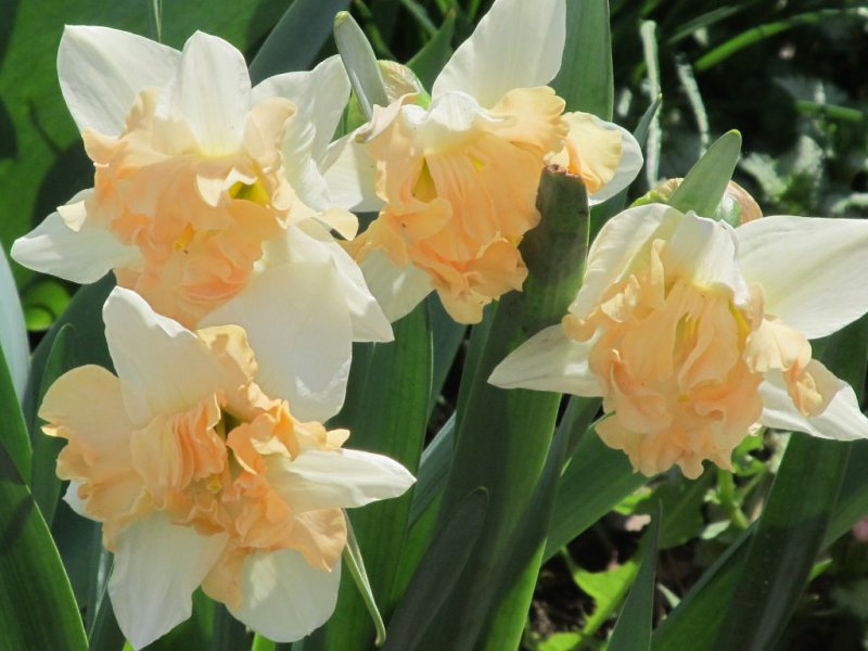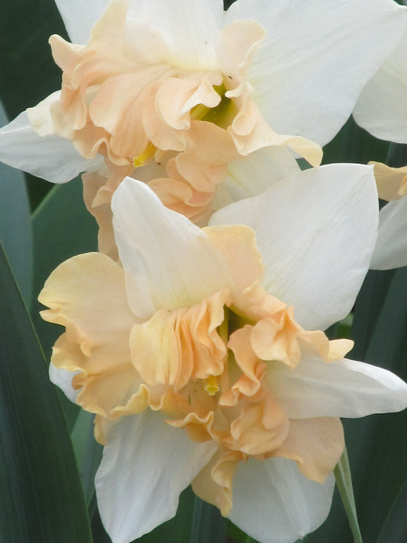 На первом фото нарцисс Айс Кинг, старый , добрый надежный сорт. В первые дни махровая коронка с желтым оттенком, потом со временем выгорает до молочно-белого.