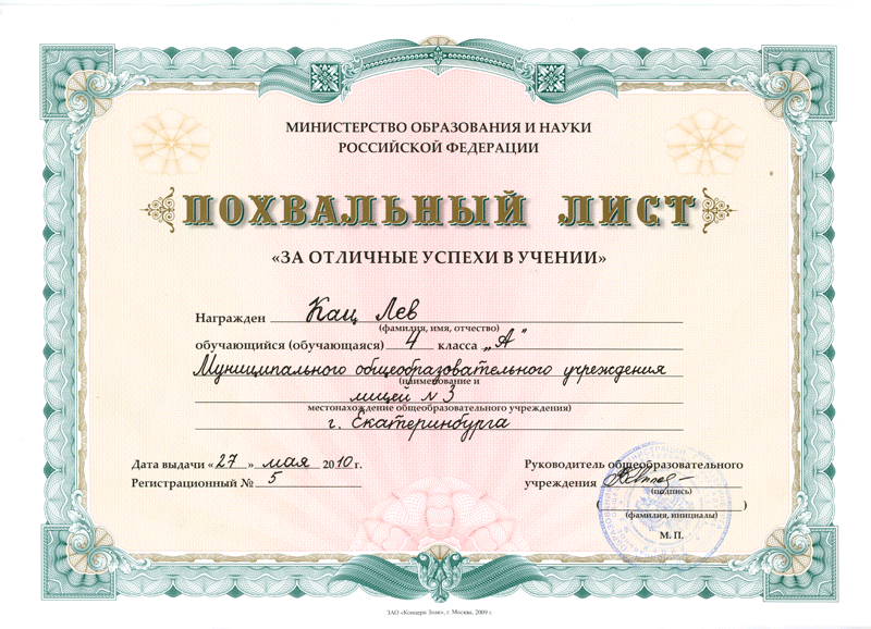 Мне сын сегодня задал такой вопрос: дадут ли ему в конце года благодарственное письмо за отличное окончание начальной школы? Судя по предыдущим наградам, полученным в школе, их выдают от имени Министерства Образования под подпись родителей. А на СО как с этим обстоит дело?